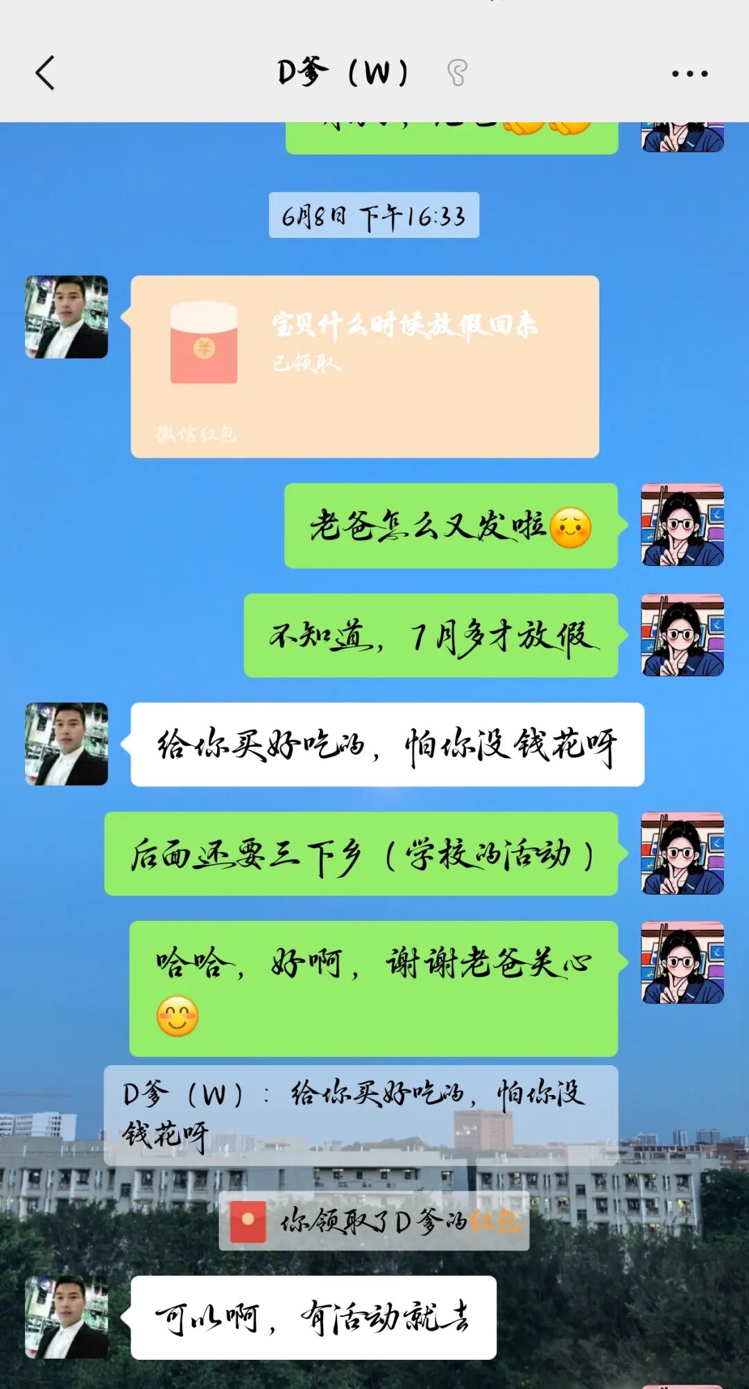 平常与父亲交流总是寥寥片语,多是转账记录和一些鸡汤短视频,话题也总是围绕少吃外卖、少玩手机,少熬夜展开。虽然琐碎无趣但也能感受到关切之情。
