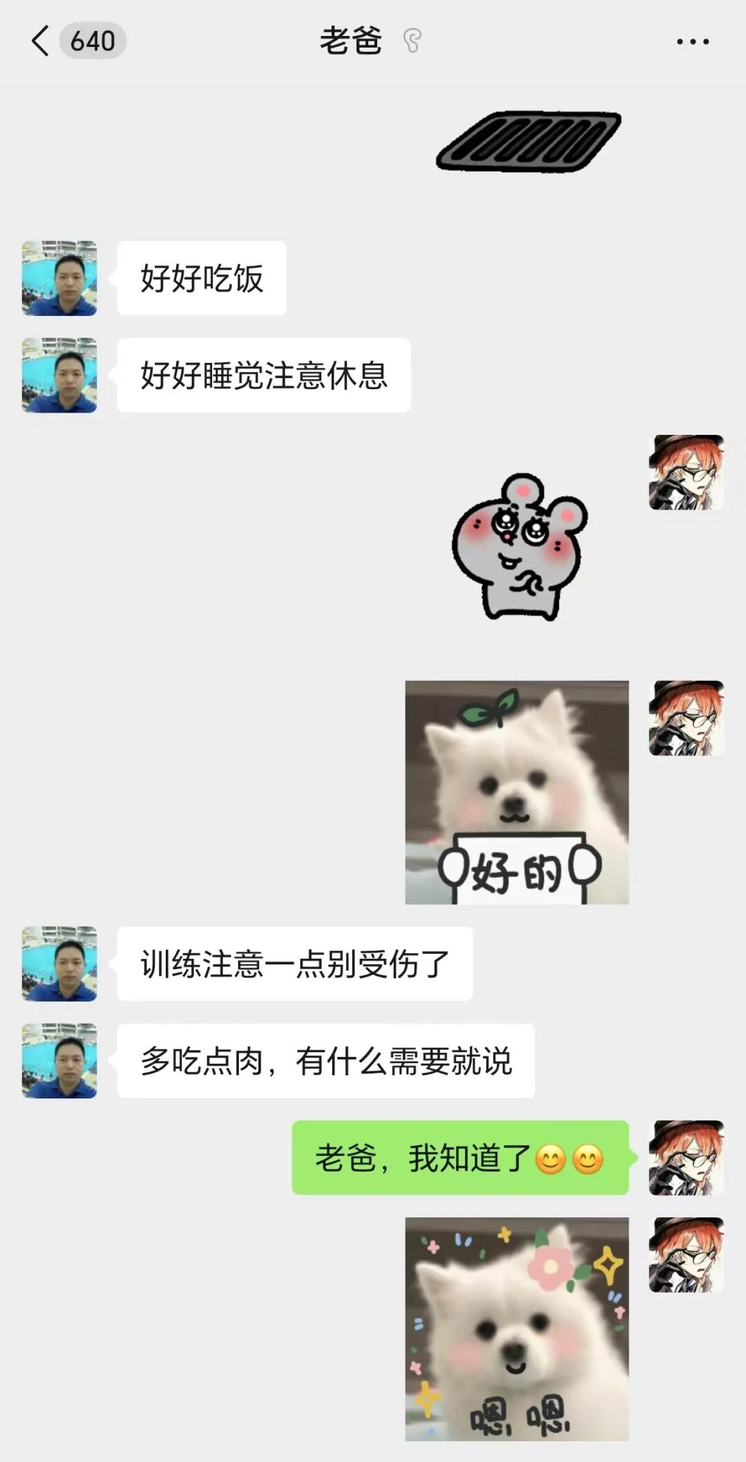 我和老爸交流超随性,他爱分享家里猫猫趣事,像晒猫咪睡懒觉照片,我就逗趣调侃 。遇到他关心我的事,比如问修电脑的进度,我会甩个好玩的表情包、梗图,把交流变得轻松又有温度,像朋友似的。这种自然又亲切的模式,藏着我们父女间独有的默契和爱。