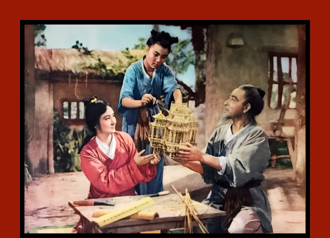 1958 年,孙瑜执导了他电影生涯里最后一部故事片《鲁班的传说》(之后的《秦娘美》乃戏曲片)。影片讲了三段与鲁班有关的故事,第一段最好,成就了一笔嫁妆。有情人在互望,而鲁班正准备消失在人海。第二段也好,鲁班让没心思好客的人,还得殷勤地招待自己。空间设计上与日本电影相仿,人占据屋内的一部分,留出的另一部分像是在凝视着这位自命平凡实际非凡的大工匠。第三段稍差一些,主要是白了一些,也让鲁班的神秘感散去了一些,但还是很好。鲁班在做梦,梦到花,梦到风车,梦到他走过的山山水水。可以说,他在与他的神思相会。一般电影有此段落时,会有些肉麻,而孙瑜只是推开了窗,窗外便有了桃红柳绿。这是学不来的,看看就好。