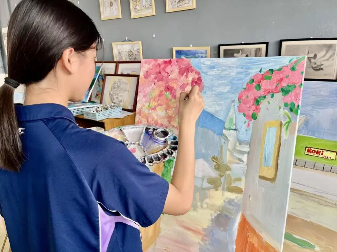丙烯绘画区色彩浓烈夺目。学生们从观察中捕捉灵感,精研光影、空间表现,探索色彩心理,通过色调、明度变化营造氛围,调和色彩的和谐与对比。这些创作探索化为独特视觉语言,让作品情感极具感染力。