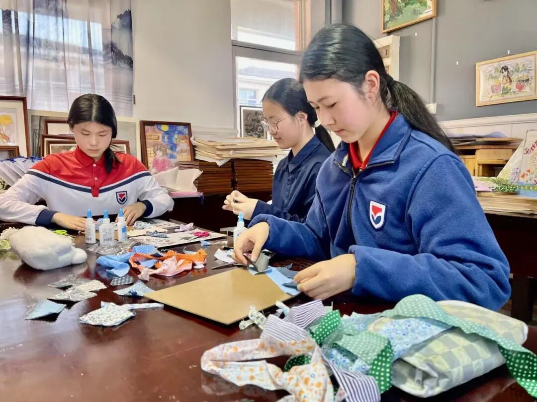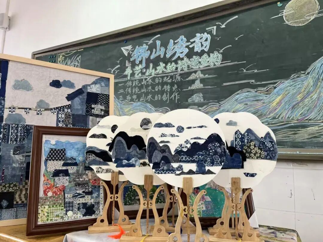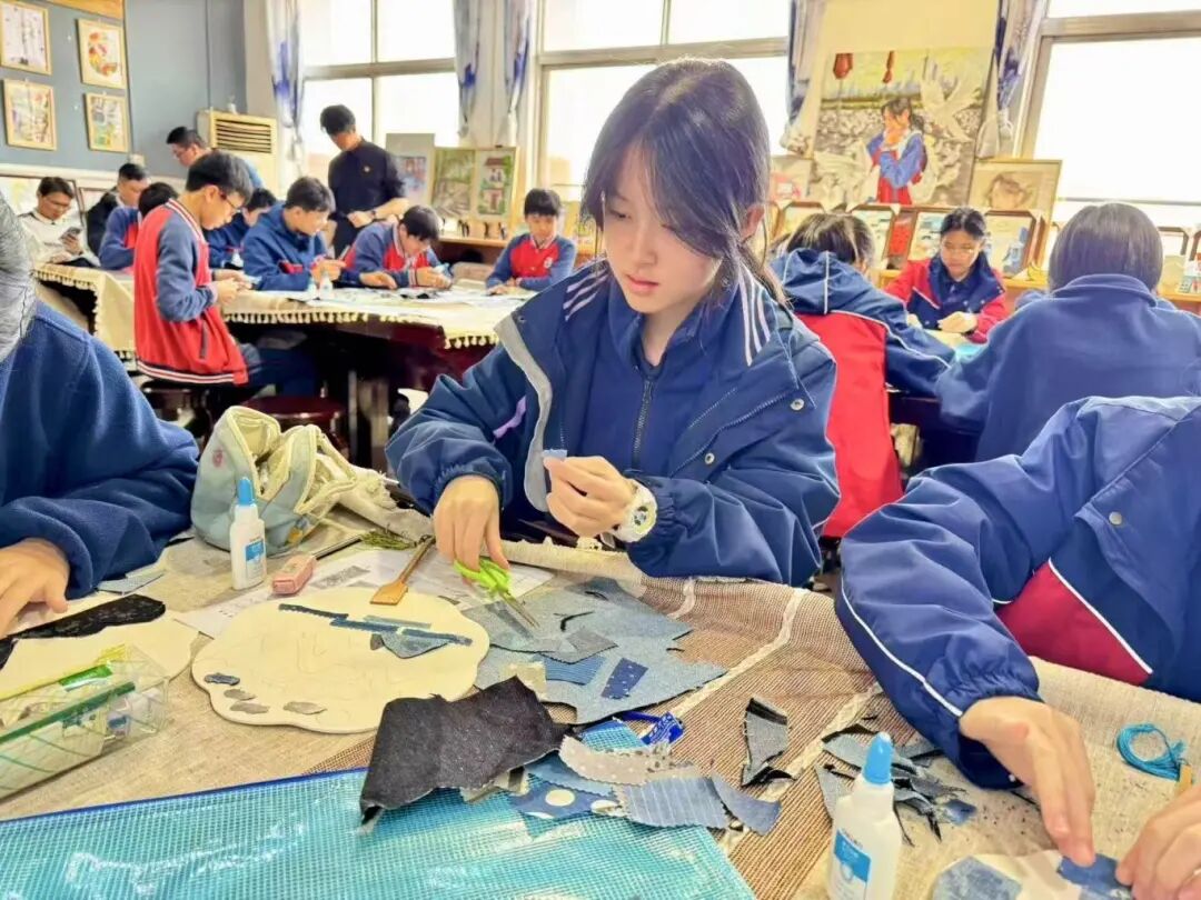 八年级展区里,温暖斑斓的布艺世界令人眼前一亮。学生们大胆融合多元材质,将传统山水、人文景观巧妙织入田园画卷,借布料独特肌理诉说景物故事,以国画般的色调晕染出悠远意境,尽显别具一格的艺术创意。