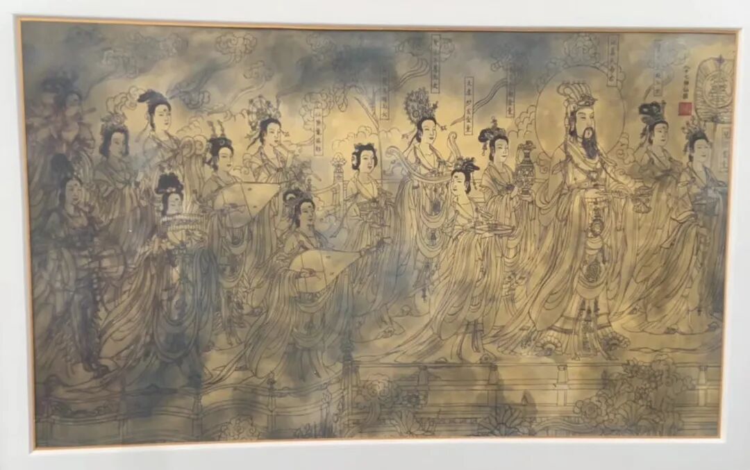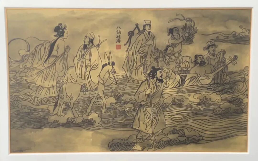 赵枫老师以国画白描技法,在古朴的牛皮纸上临摹《八十七神仙图》与《八仙过海》。笔下线条飘逸灵动,精准勾勒人物形态、铺陈神话场景,将传统神话的宏大意境与神韵展现得淋漓尽致,尽显深厚的传统绘画功底。