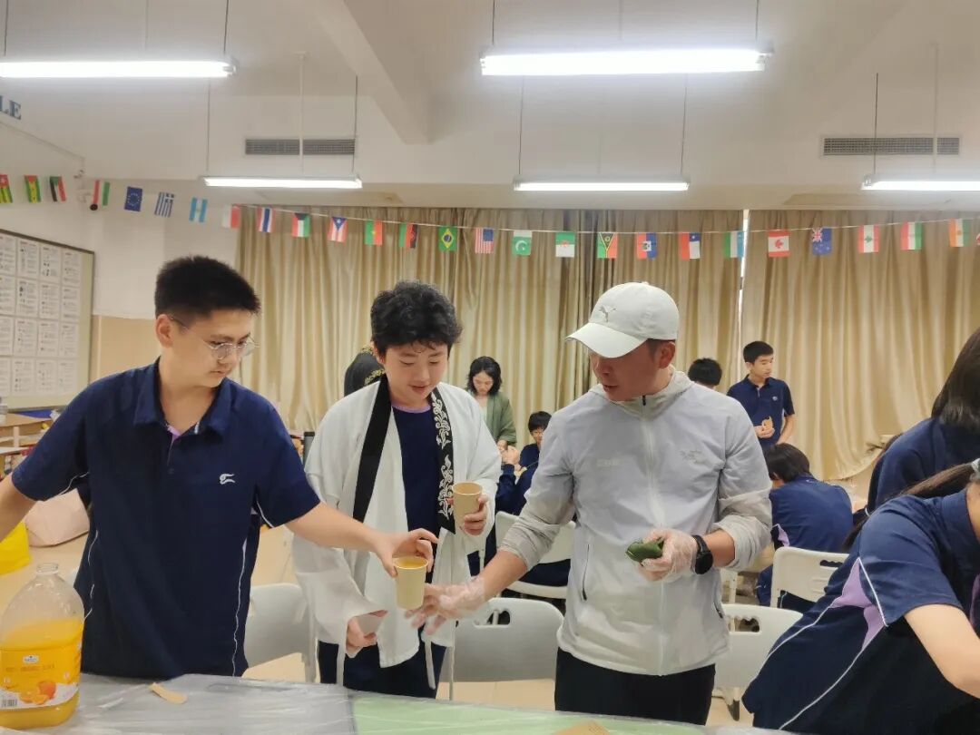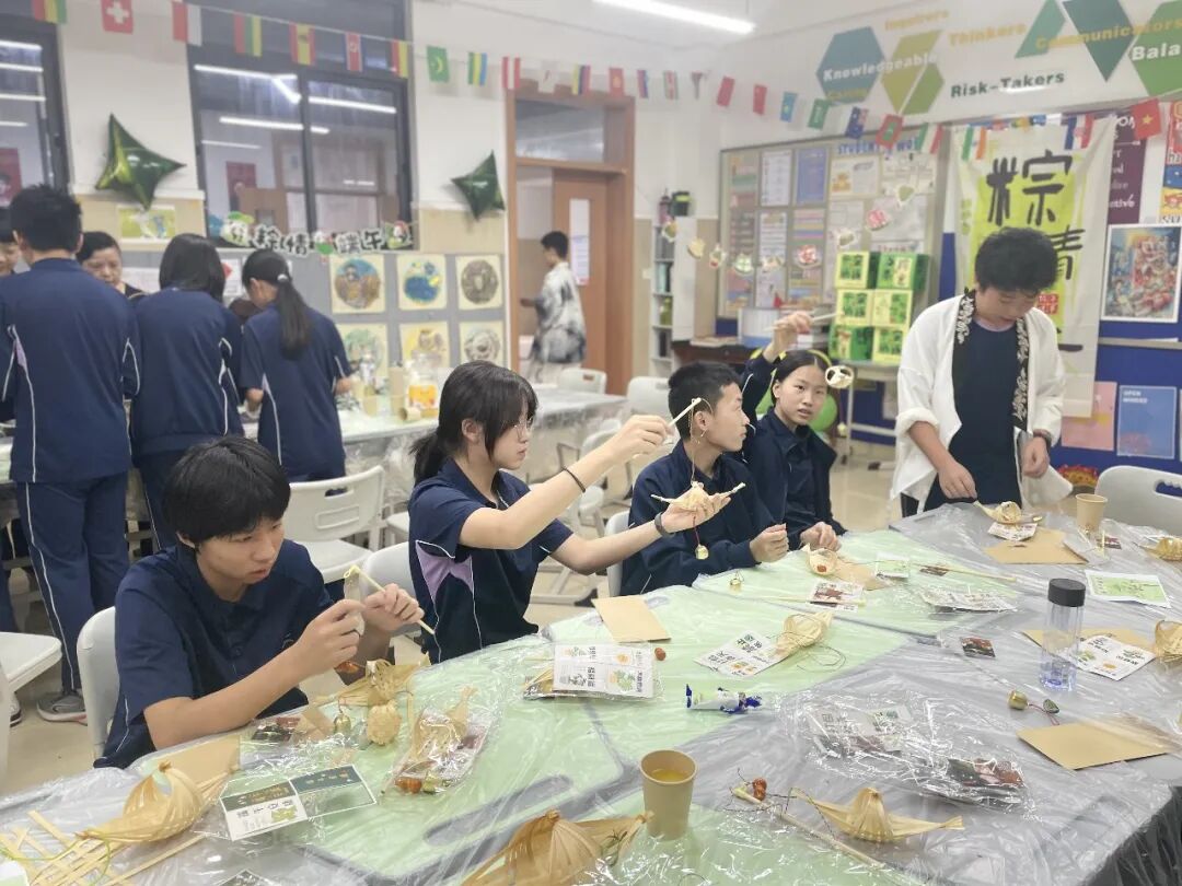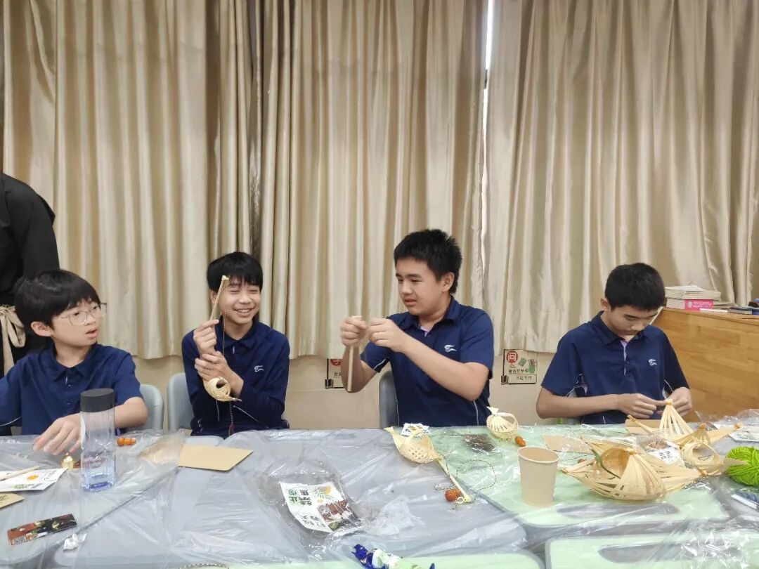 家委导师现场演示传统四角粽包法,糯米的雪白、粽叶的青绿与咸蛋黄的金黄在指尖交织。同学们不仅学会了“一折叶、二盛料、三包裹、四缠线” 的经典技法,更大胆尝试加入紫薯丸等创新食材,让传统包粽技艺在色彩与味觉的创新中,成为跨越古今的文化载体。