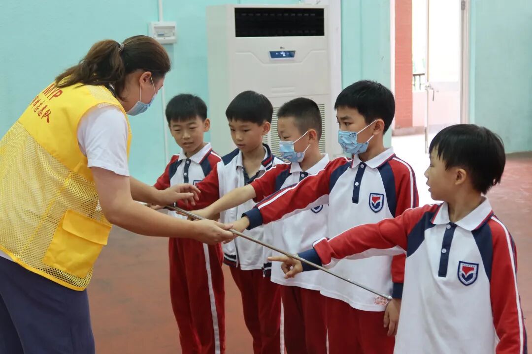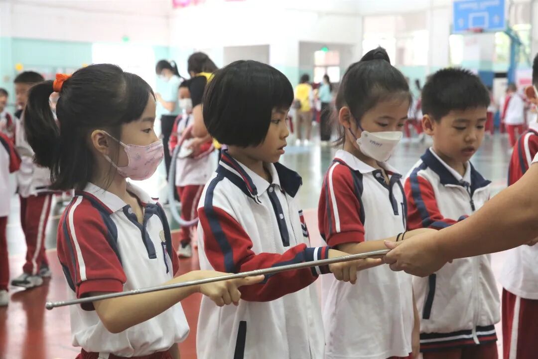抬起这根细细的同心杆?这么容易?同学们信心满满,却发现事情并不简单。所有同学伸出食指,手心朝下,将杆子水平抬至眉毛处。最重要的是,保卫同心杆的任务不允许任何一个同学掉队噢!