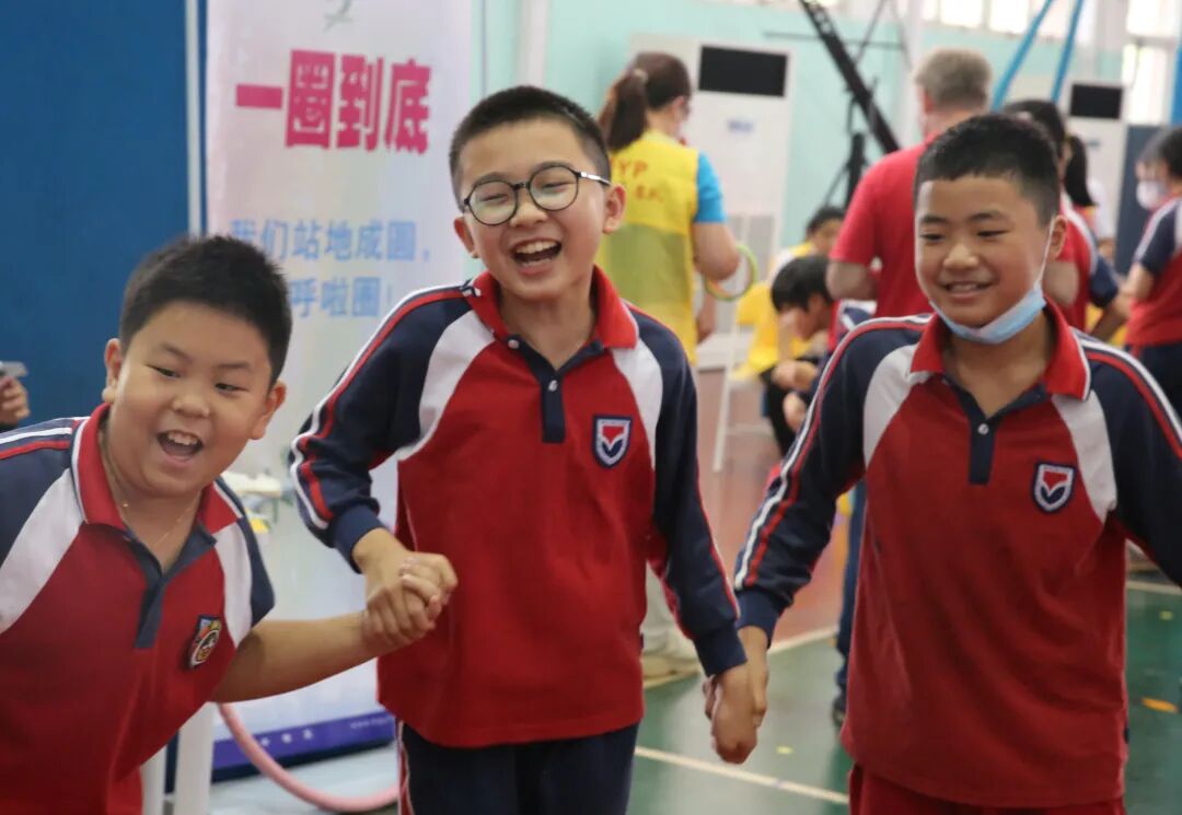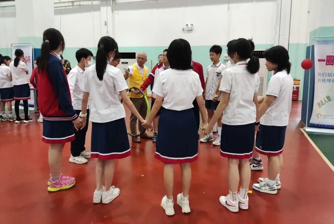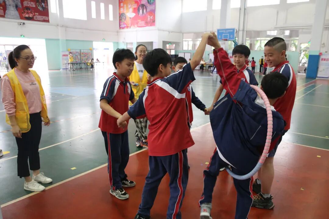 看,同学们手拉手,穿过呼啦圈,以最快的速度一圈到底!