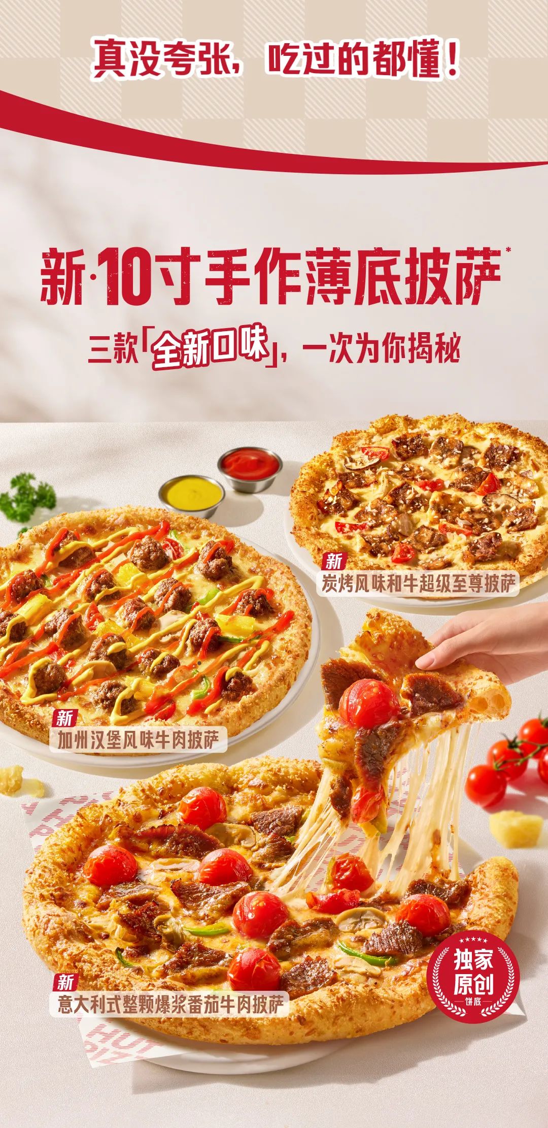 * 图示“寸”指“英寸”,10英寸约25厘米,系薄底披萨饼底直径。实际产品请以菜单所标注的克重为准。独家原创饼底指由必胜客独家研制新10寸手作薄底披萨饼底。