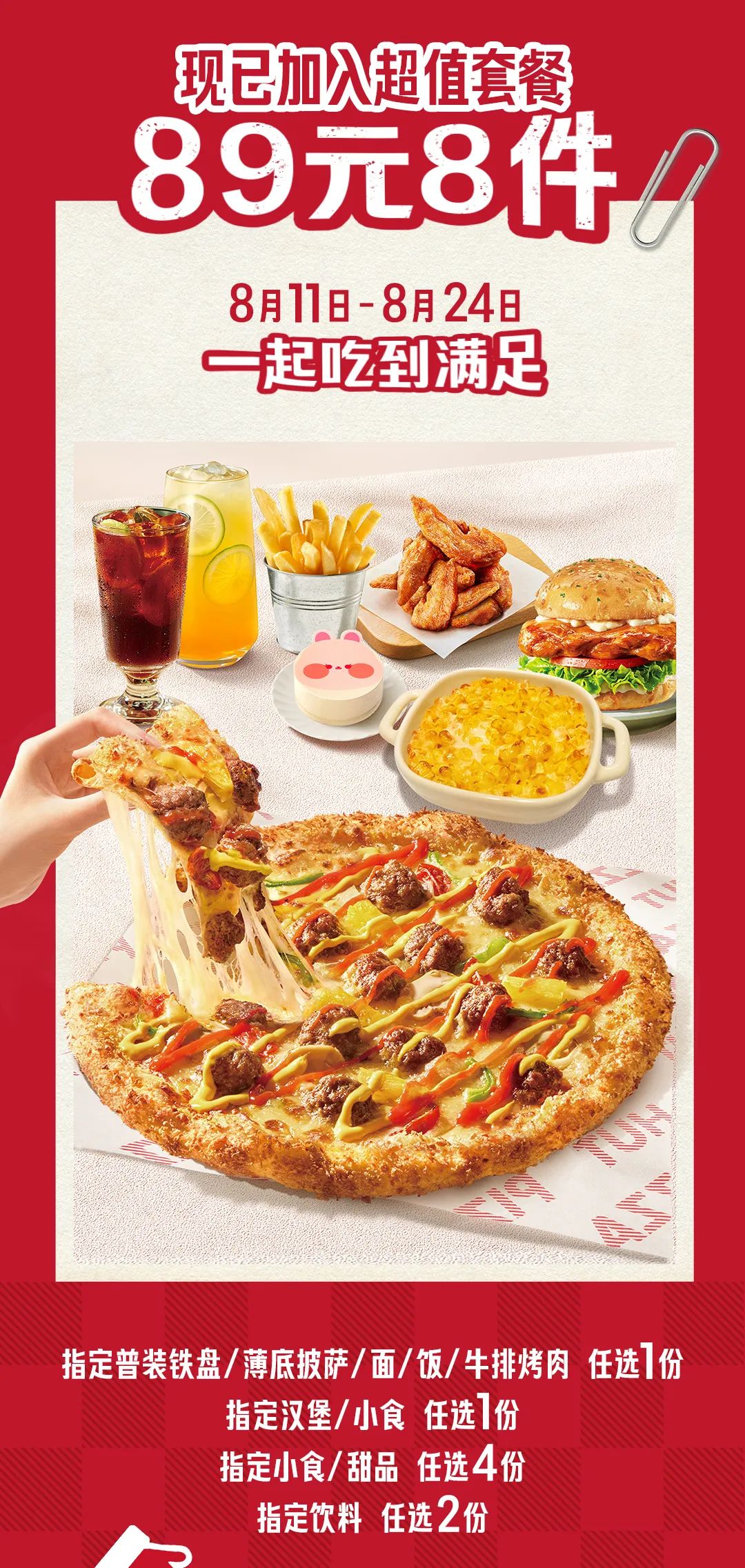 【注2】自2025年8月4日起,加州汉堡风味牛肉披萨共限量600,000份,售完即止。本券有效期为2025年8月11日至2025年8月24日;仅限10:00-22:00使用(不同餐厅营业时间均有所不同,请以餐厅实际营运时段为准)。