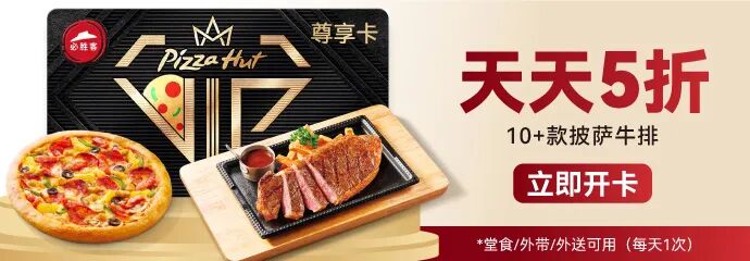 可用渠道:堂食、自助点餐(扫码点餐+预点餐+外带自取)及必胜客宅急送官方网络订餐渠道使用。