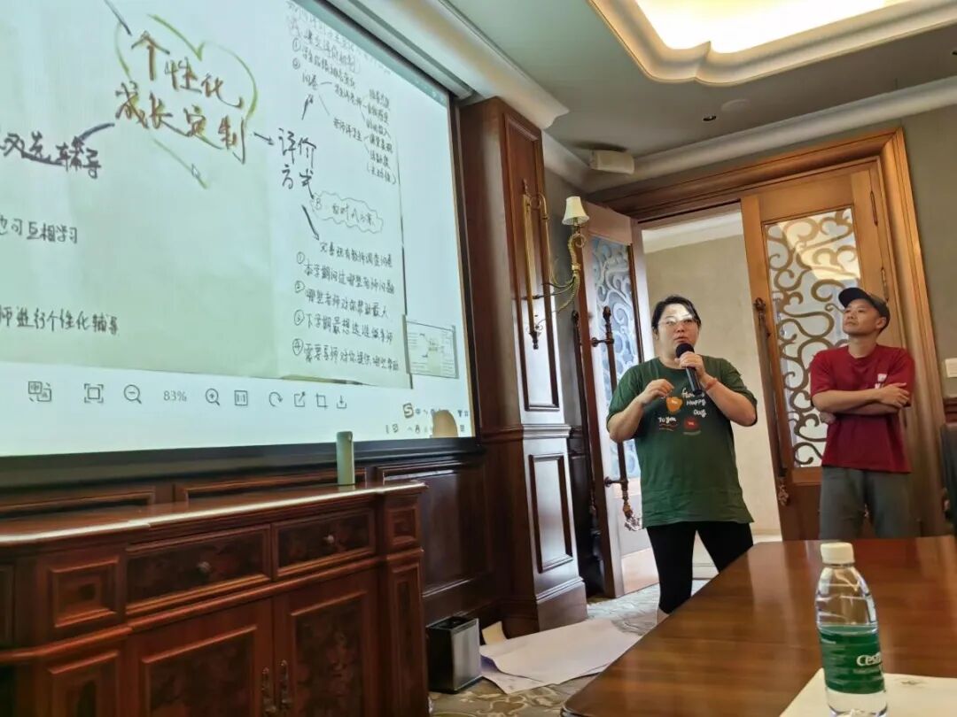 第三小组代表张洁主任、林海老师针对学校师生实际,进一步优化我校已有的双师制、导师制,为大家汇报了学生个性化成长的定制方案,不仅从参与对象、导师选拔、辅导频率、辅导地点等各方面进行考虑,方案还进一步调整了评价方式,关注师生互评互促的落实。