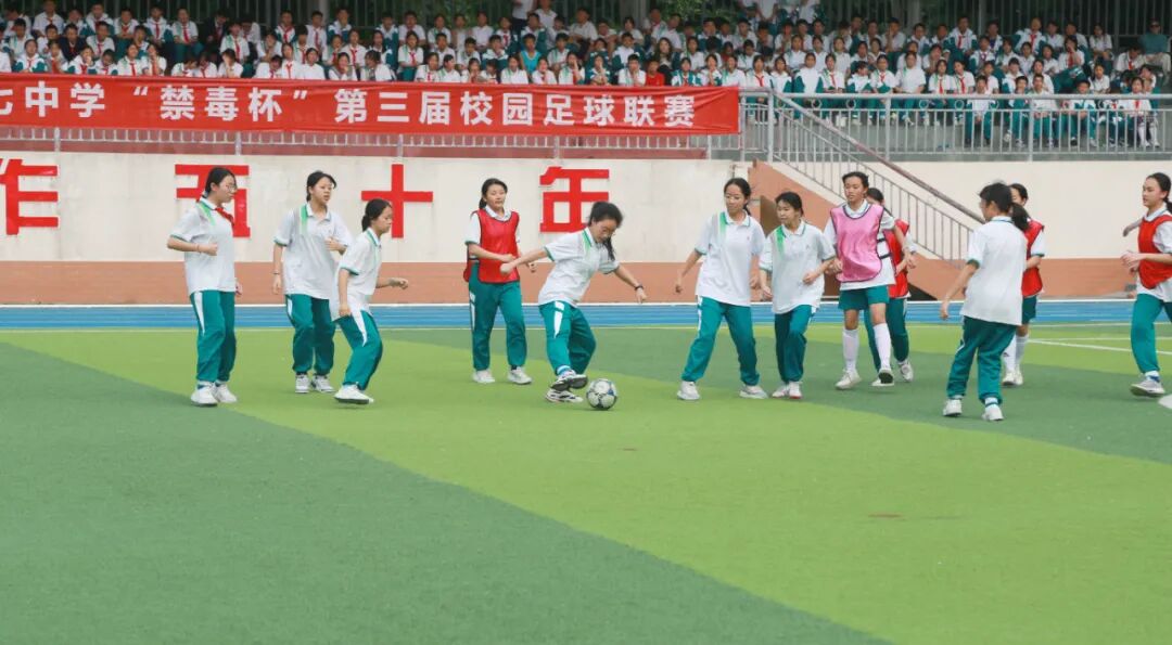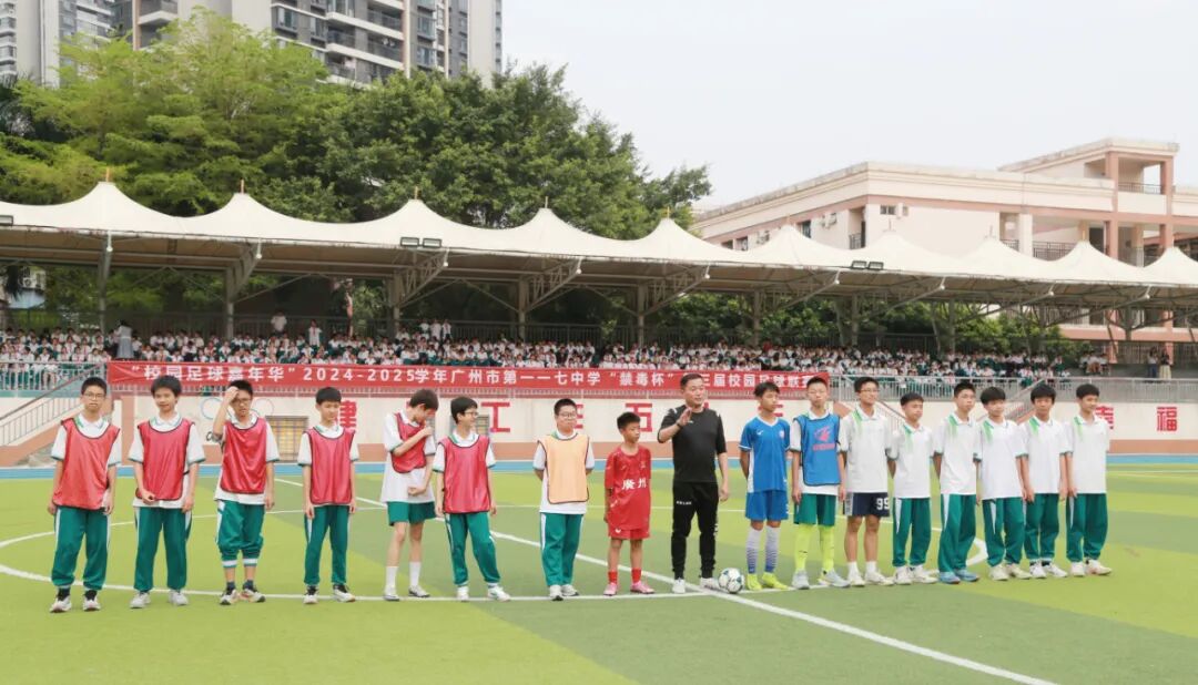 3月-4月,风和日丽,阳光明媚,广州市第一一七中学的绿茵场上燃起了青春的战火。第三届“校园足球嘉年华”2024-2025学年“禁毒杯”七年级足球联赛盛大开启,这不仅是一场足球的狂欢,更是一次宣传禁毒知识的契机,成功将体育精神与禁毒理念完美融合。