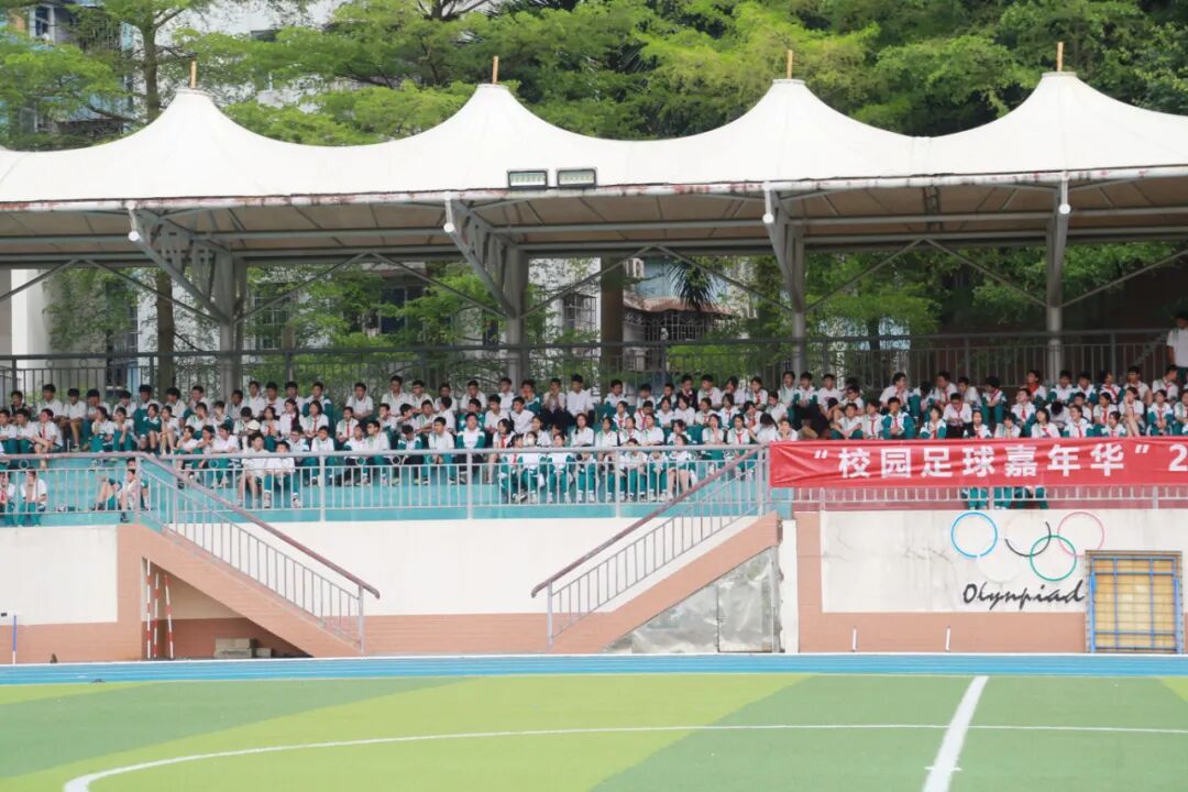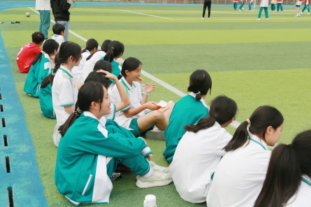 看台上,观众们的热情丝毫不输场上球员。各班级自发组织的啦啦队,挥舞着自制的加油牌和彩旗,有节奏地呐喊助威。“初一12班,大力射门”“初一4班,单刀必胜” 等口号声此起彼伏,响彻整个校园。有的同学甚至制作了气势恢宏的横幅,为自己的班级加油打气。每当有精彩的进球或防守,全场都会爆发出雷鸣般的掌声和欢呼声,成为赛场上一道独特的风景线。