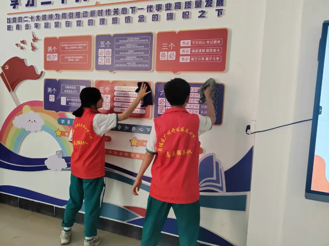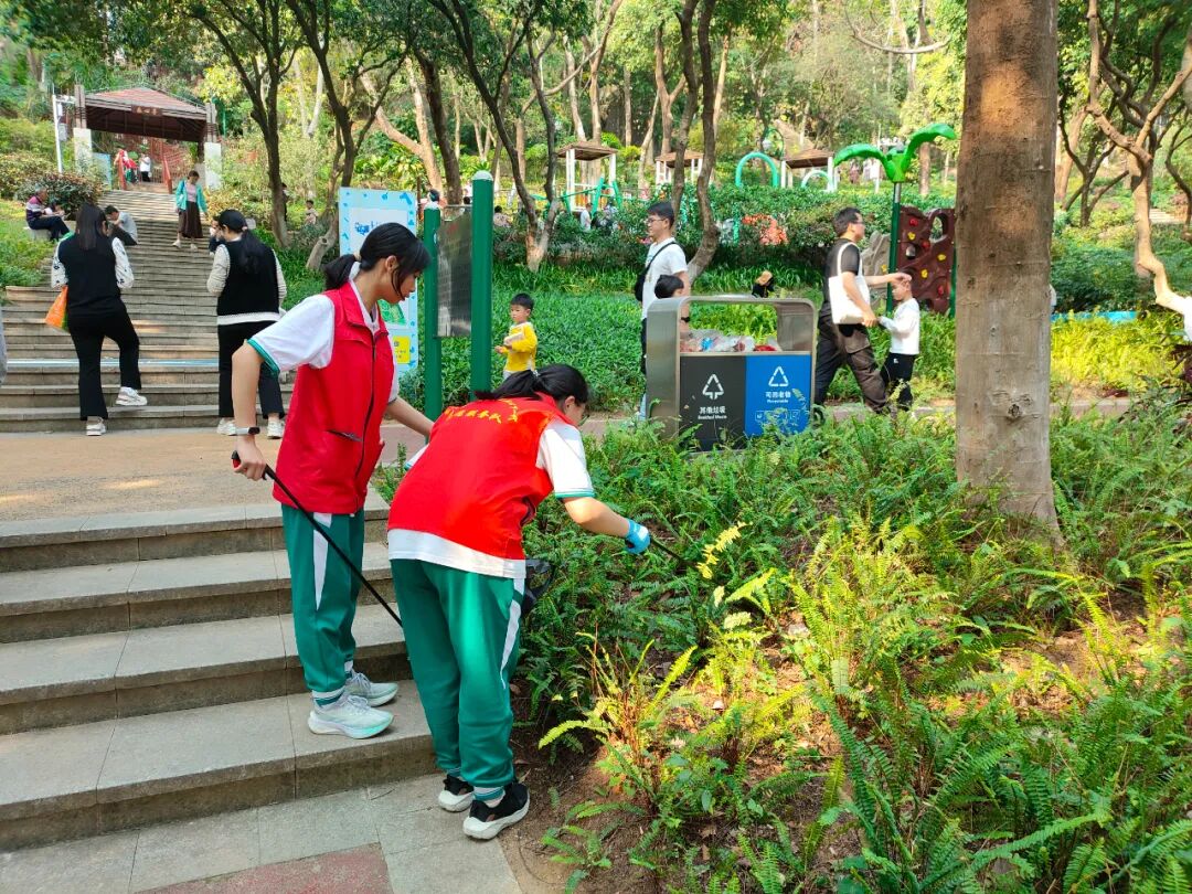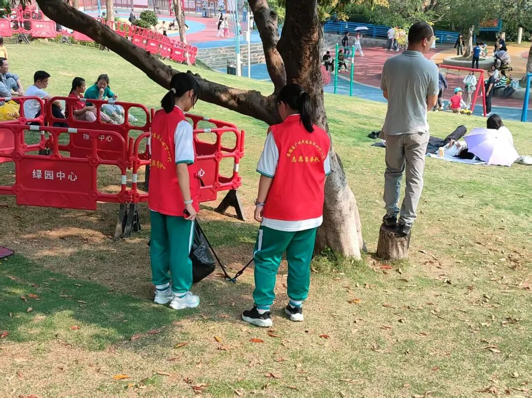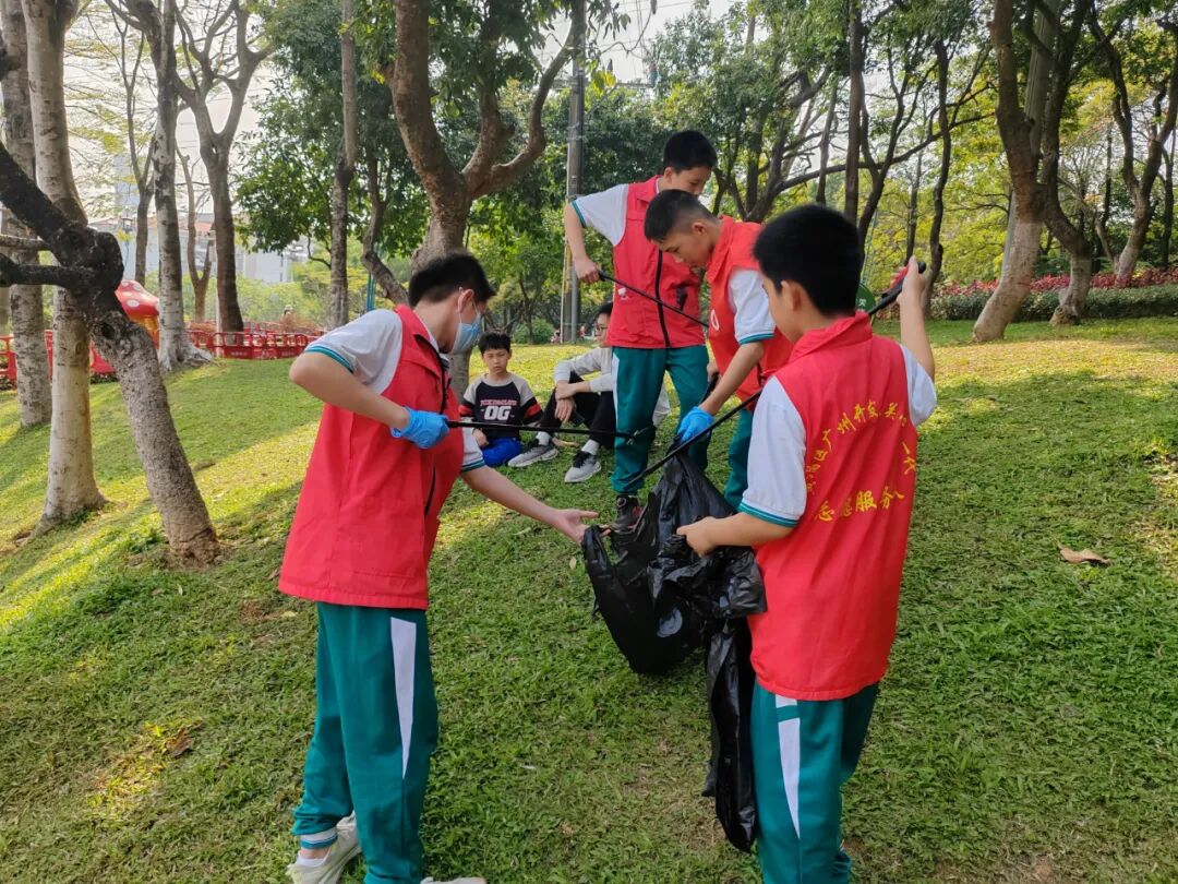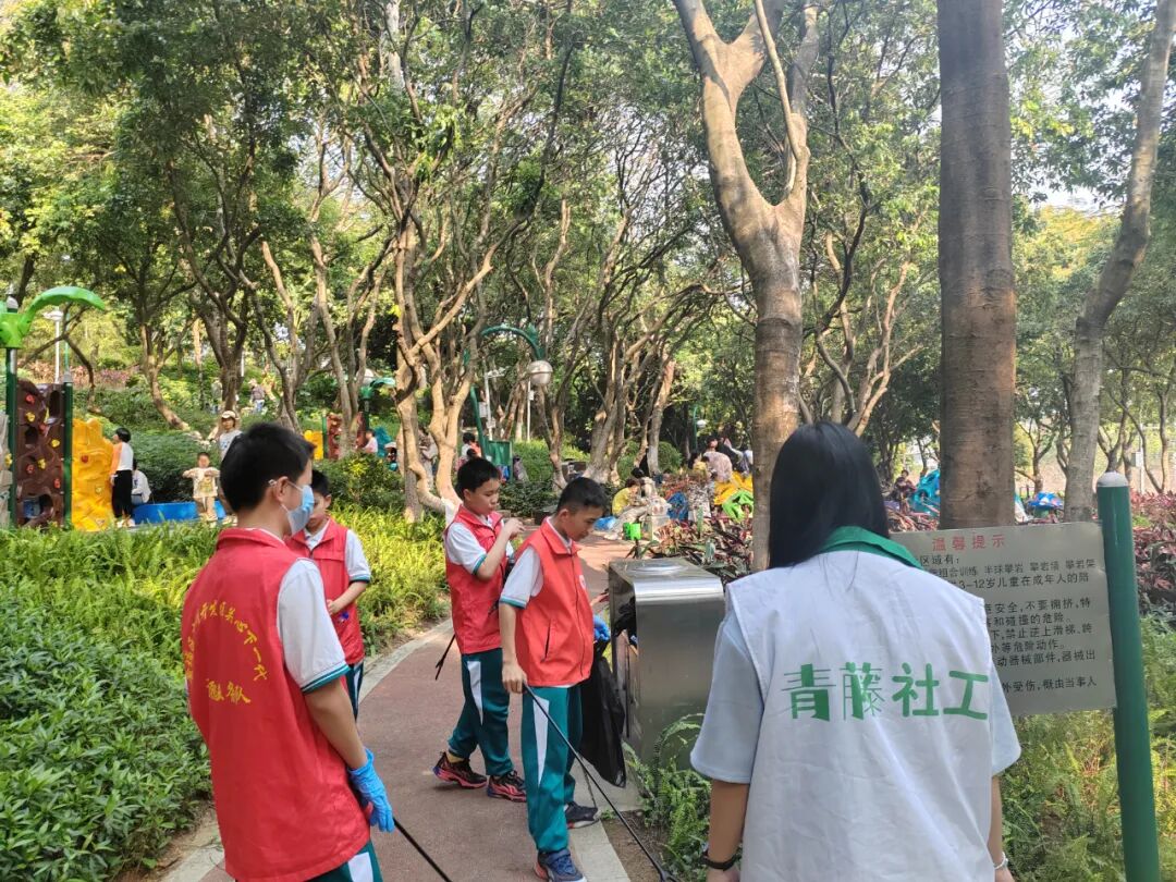 3月23日下午,“学雷锋精神,做时代新人”青少年绿美黄埔志愿实践活动在广州市萝岗儿童公园举行,活动由黄埔区青年地带简社工组织。在简社工的带领下,我校学生志愿者捡拾垃圾、清理杂草、擦拭地板和宣传栏等,他们忙碌的身影成为公园里一道亮丽的风景线。