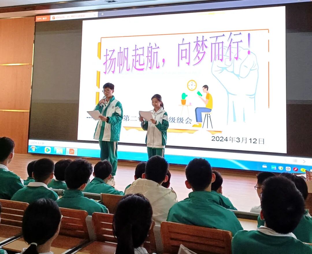 人勤春来早,功到秋华实。2024年3月12日,在这个春暖花开的日子里,我校初二年级迎来了期盼已久的年级大聚会,以“扬帆起航,向梦而行”为主题的初二级级会在学校报告厅举行。本次会议由黄若琳、莫智谦同学主持,初二全体同学参加会议。