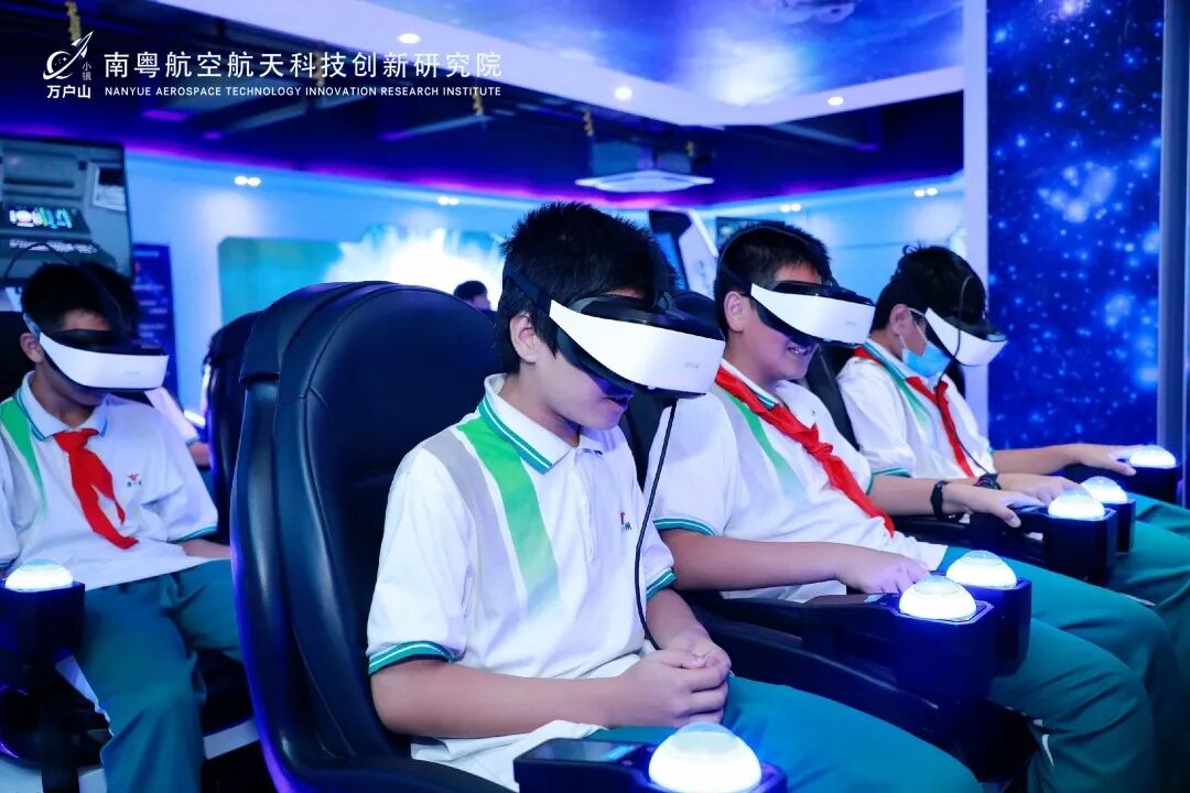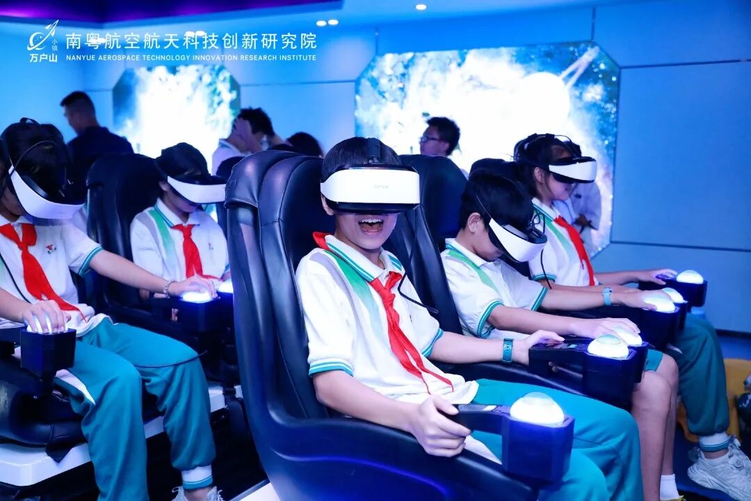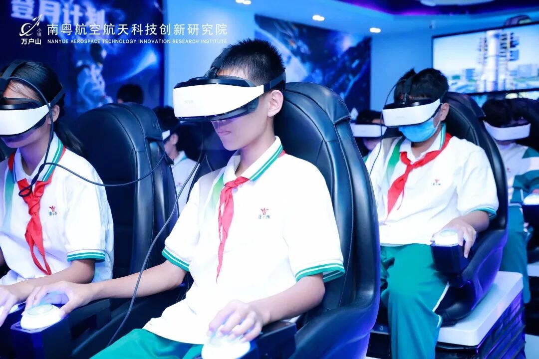身临其境的VR体验,引起了同学们对宇宙的向往,唤起科学梦想。坐上VR模拟飞行器,戴上VR眼镜,同学们体验了中国载人探月工程从火箭发射到登陆月球,再携带月球矿石圆满返回地球的全过程。