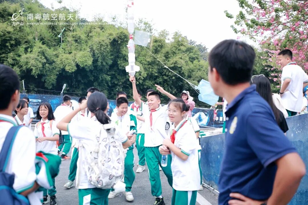 火箭在倒数声中“3,2,1”飞上天空,同学们为自己小组制作的水火箭顺利飞上天空并且顺利下降而欢呼,每一位同学都露出了成功的笑容。