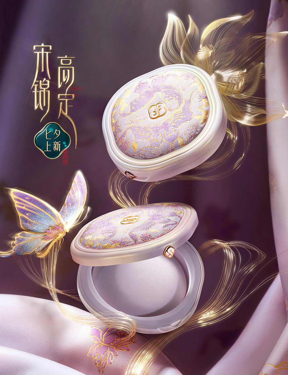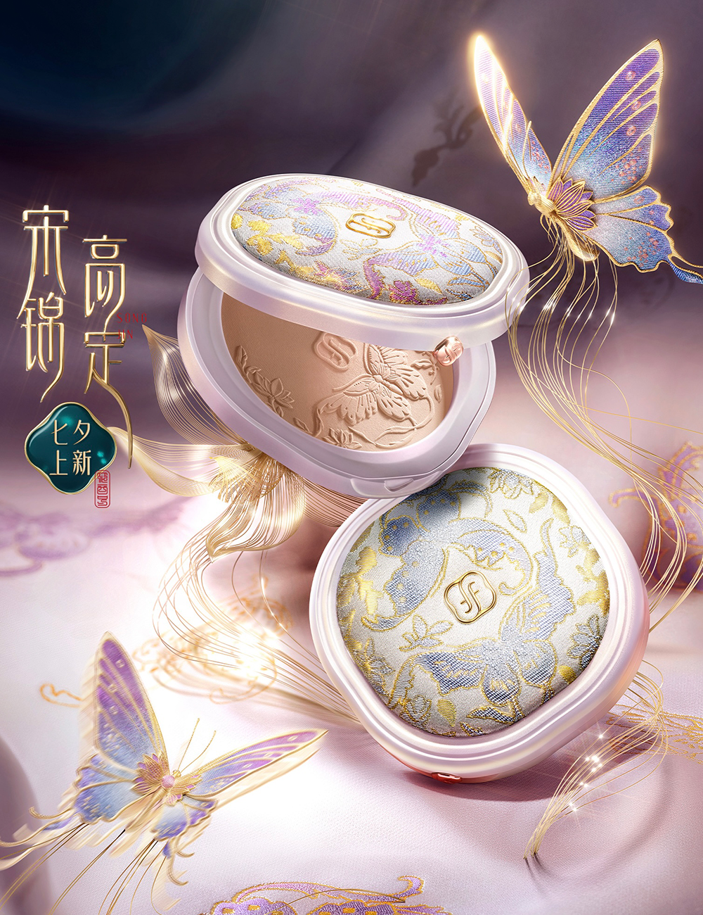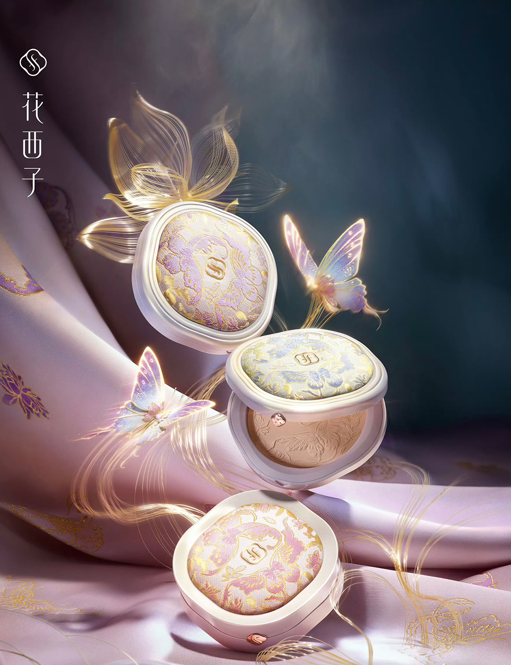 花西子携手国家级非遗保护单位苏州丝绸博物馆,将宋锦布料融入产品设计,推出“好气色系列”宋锦高定版,共包含气垫、蜜粉饼以及防晒粉饼三款产品。产品外观传承了宋锦经纬联合显花工艺,创新采用紫外线感光宋锦面料,以金丝入锦,遇光呈现鎏金光泽。同时,与非遗宋锦传承人王晨合作,沿袭喜相逢经典纹样,共创彩蝶戏莲喜相逢纹,呈现传统非遗技艺之美。