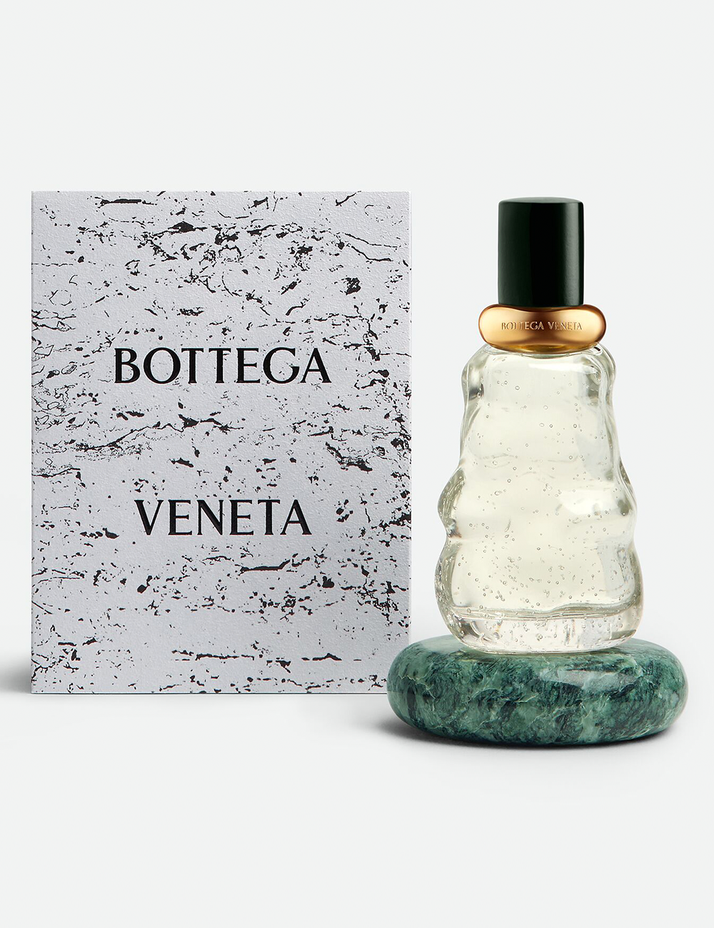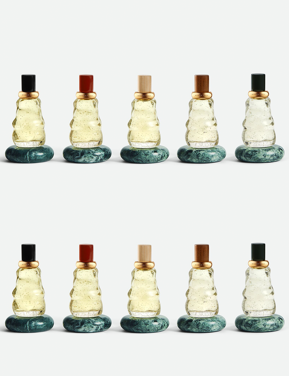 该系列灵感源自于Bottega Veneta的发源地威尼斯,外观设计上,木质雕塑感瓶盖搭配金属雕花环饰,配色因香而异;香水瓶整体的流动造型对应威尼斯的水韵之美;瓶身保留了玻璃吹制工艺留下的气泡痕迹,定格时间的纹理;绿色Verde Saint Denis大理石底座其石材原料是威尼斯建筑中常用的石材。共推出了五款香水:幻变、悄悄话、暖煦、海拂、夜至,由Bottega Veneta自营渠道出售。