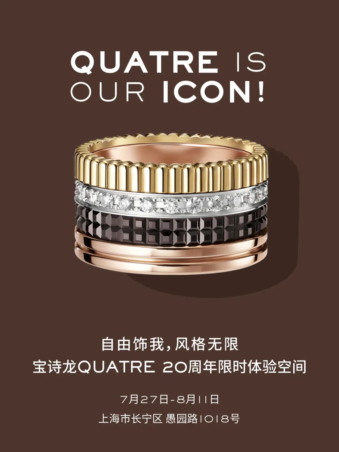 为庆祝标志性Quatre系列诞生20周年,Boucheron宝诗龙将打造限时体验空间。现场除了可以试戴Quatre系列的经典设计、春夏新作和高级珠宝作品等,还设有留影区、自由型格体验空间和世家咖啡快闪空间。