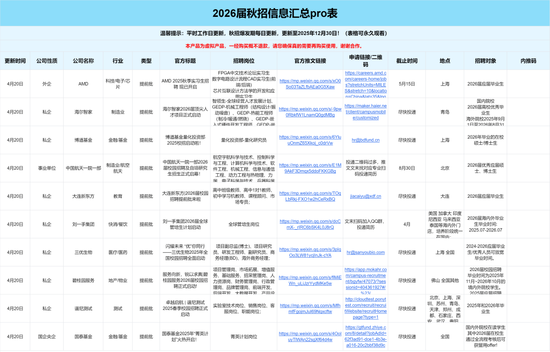 平时工作日更新,到了秋招爆发期每日更新,更新至2025年12月30日! 包括国央企、事业单位、私企、外企、合资企业,全行业类型! 涵盖互联网/金融/科技/制造业/咨询/快消/医药/地产/教育/文娱等行业 建议同学们提前做好准备,以免错失良机。