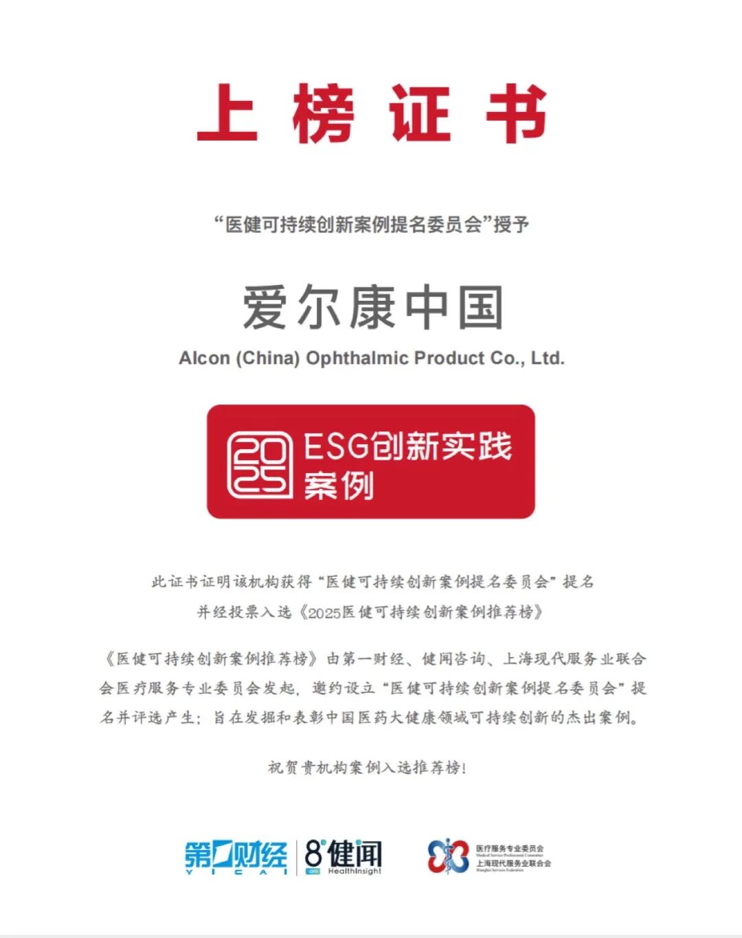 7月28日,爱尔康中国因超声乳化发展(Phaco Development, PD)项目的长期投入,荣获《2025医健可持续创新案例推荐榜》“ESG创新实践”上榜企业。