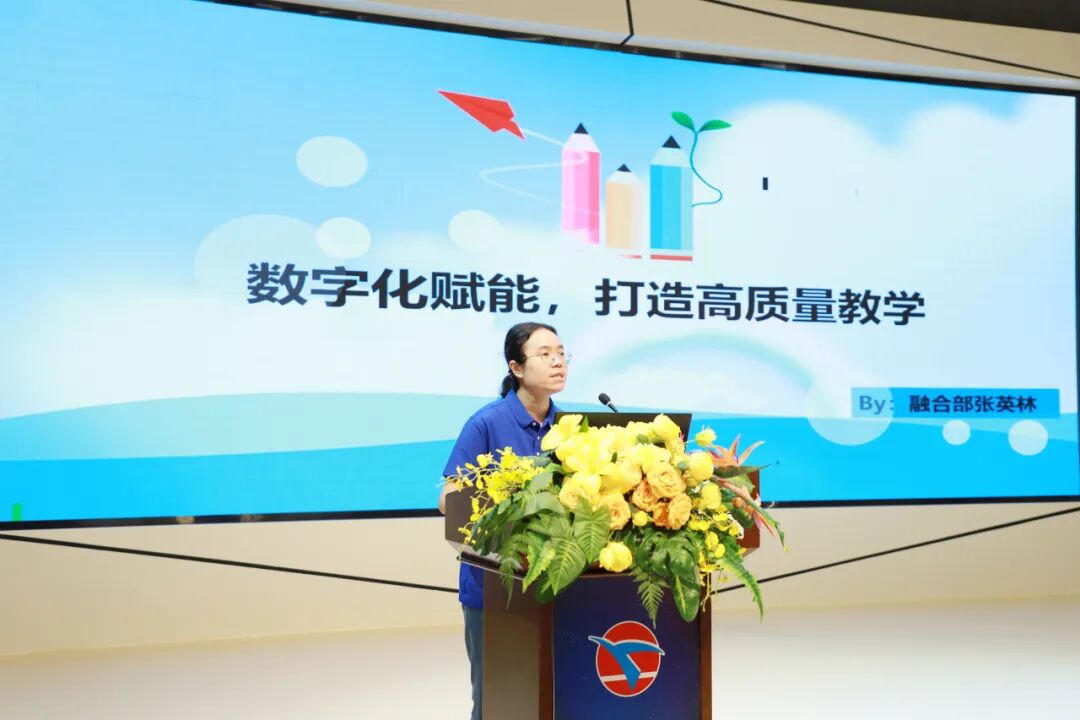 融合小学张英林老师以《数字化赋能,打造高质量教学》为题,围绕数字化赋能高质量教学展开,指出一线教师的困境,介绍如何用数字化助力备课,推动课堂教学质量提升,促进个性化教学方法的实施,强调教师应积极运用国家中小学智慧平台的资源,运用人工智能辅助教学,在用中学,在学中用。