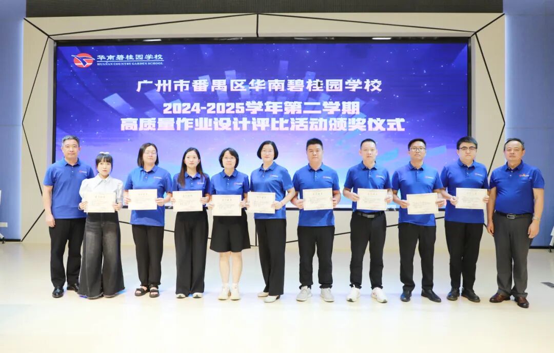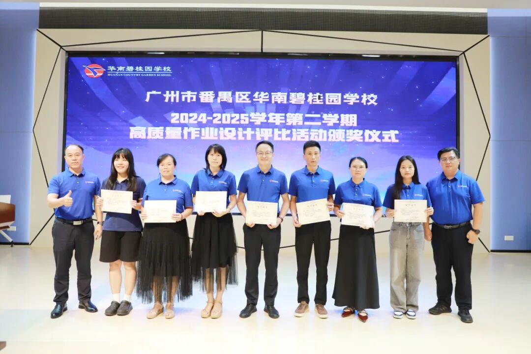 活动的最后是颁奖环节。在2024-2025学年度第二学期校级高质量作业设计评比活动中,全校共提交了50个作品设计案例,其中17个案例获评一等奖。宋飞虎常务副校长、欧阳建枝副校长、高建华副校长、郑建峰副校长为17位获奖教师代表颁发荣誉证书。