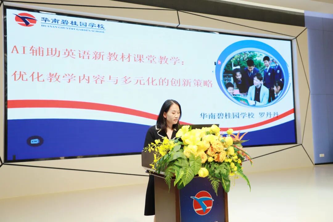 双语小学罗丹丹老师发言的题目是《AI辅助英语新教材课堂教学》。她首先说明了小学英语新教材的特点,接着阐述AI在教学多方面的应用,以图文和视频展示应用方法和成效,最后着重强调教师“传道”核心价值无法被AI取代。