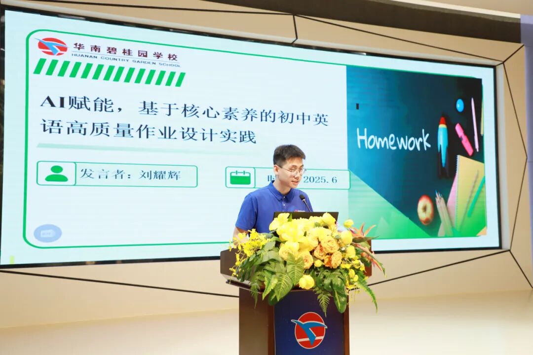 双语初中刘耀辉老师发言的题目是《基于核心素养的初中英语单元作业设计实践》,他从设计背景与理念、评价与反馈、成效与反思三个方面介绍了如何通过一系列精心设计的项目化任务,构建三阶能力发展体系,借助数字技术实施分层作业设计,发展学生语言能力与思维品质。