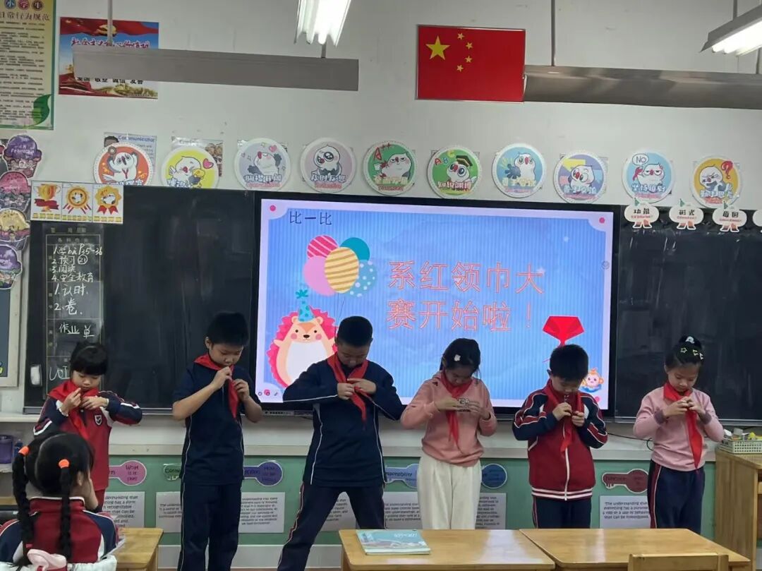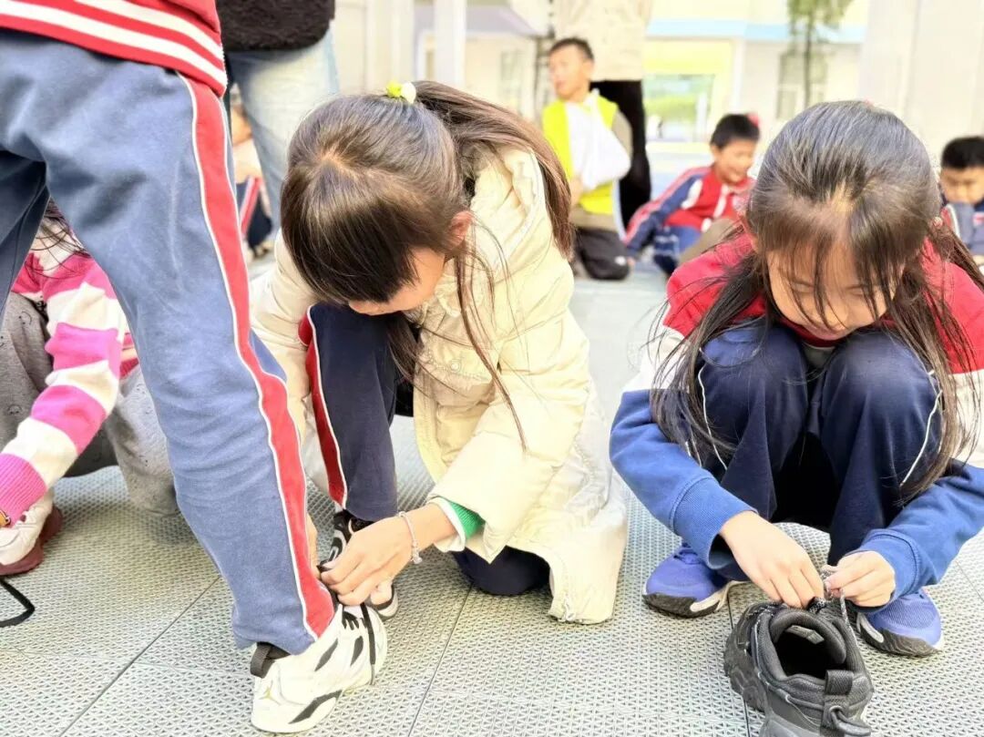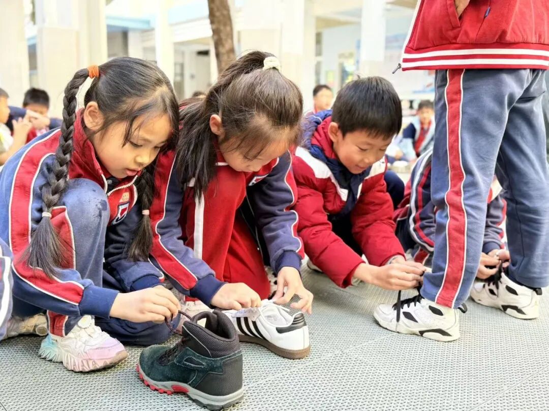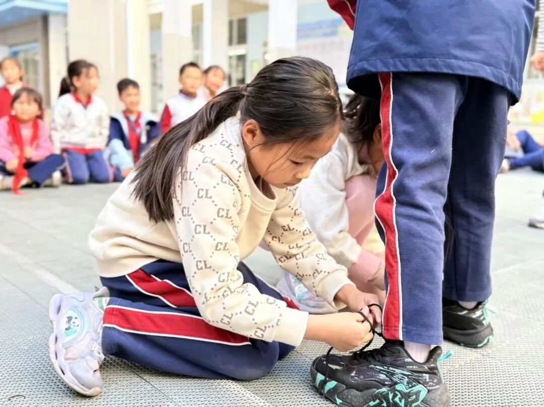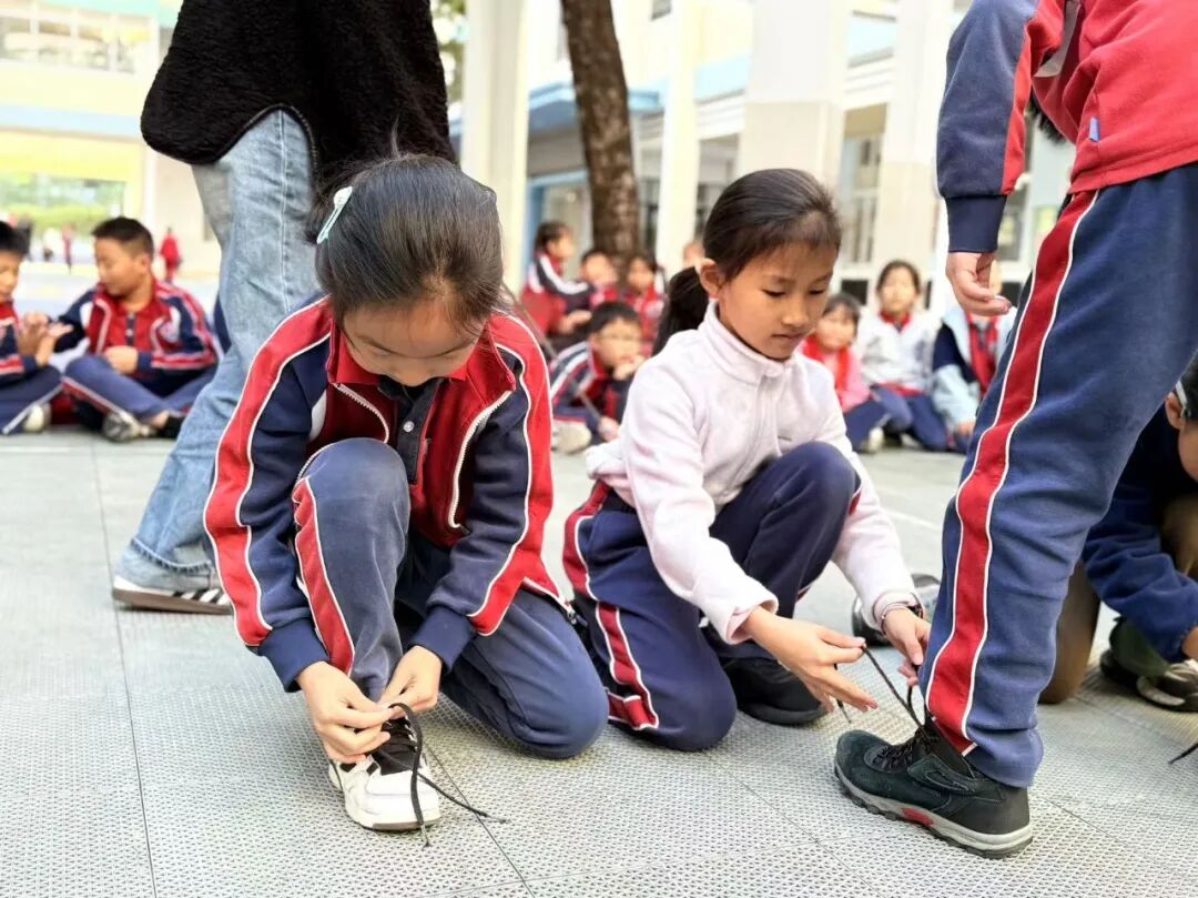 在班级比拼环节中,同学们聚精会神,双手灵活地穿梭于红领巾与鞋带之间。鲜艳的红领巾在颈间迅速成型,鞋带在鞋面上交织出整齐的花样。他们动作娴熟、一气呵成,展现出了扎实的生活技能。最终获胜的同学代表班级进入决赛。