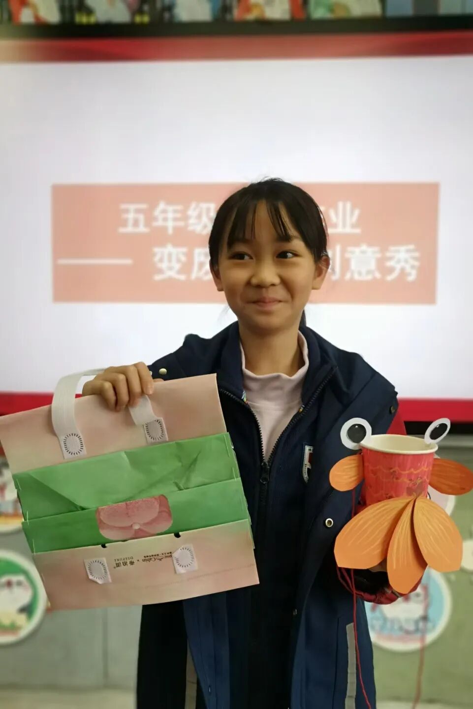 五年级的变废为宝创意秀别出心裁。同学们从身边寻找废弃物品,化身小小设计师,充分发挥创意将这些废弃物变成了新颖实用的物品。