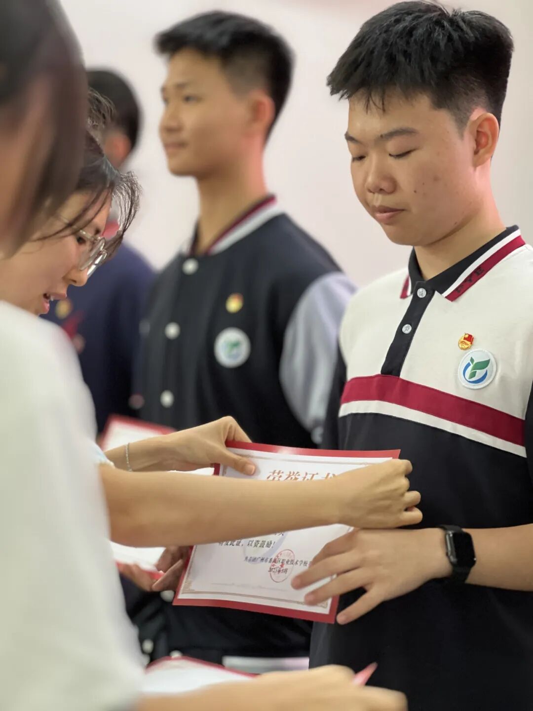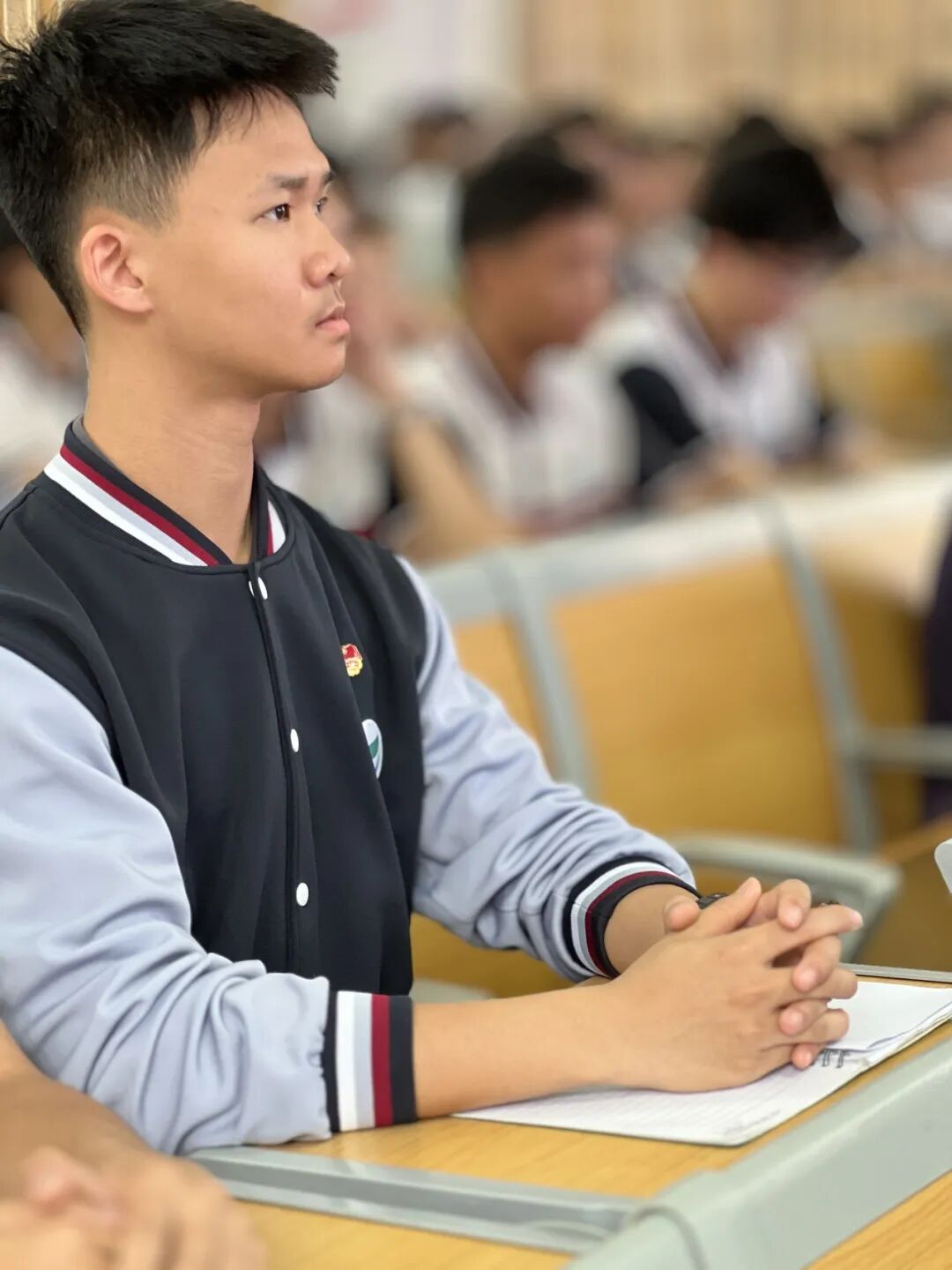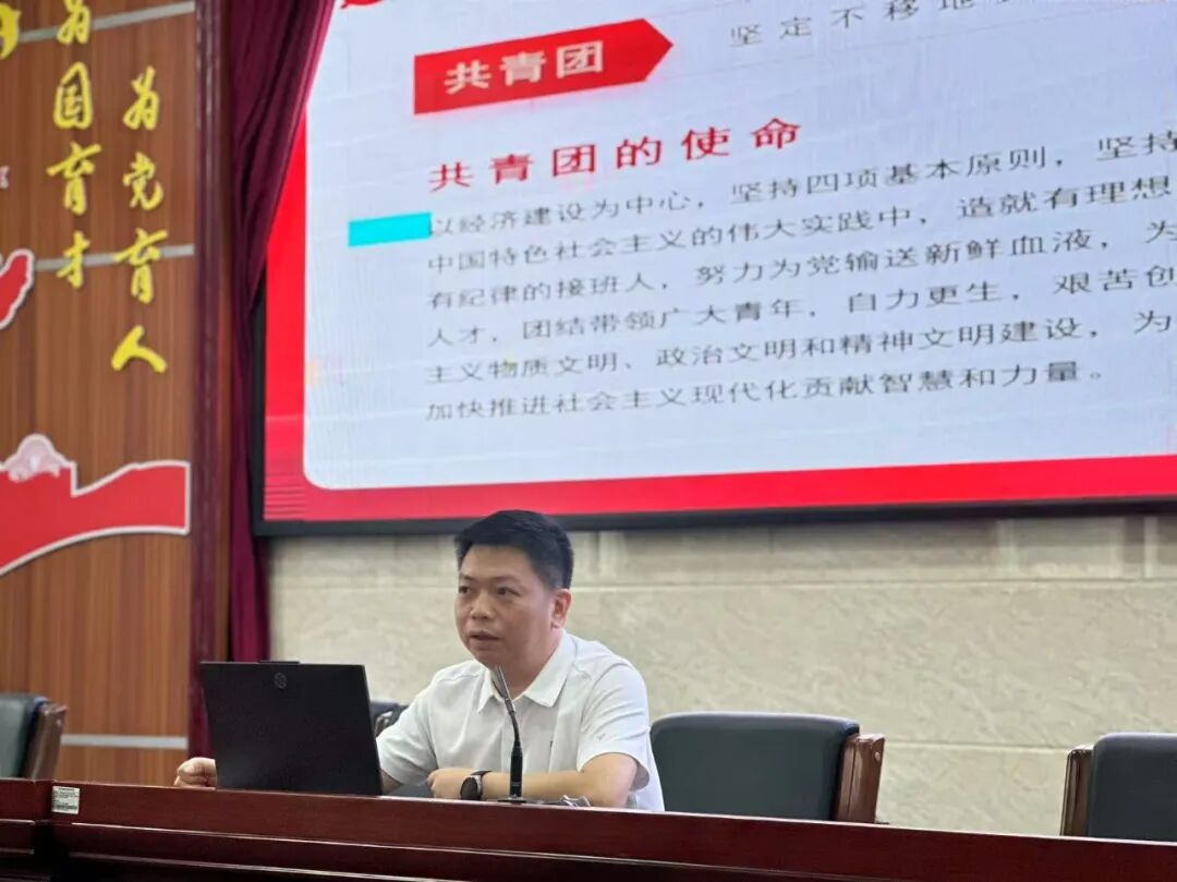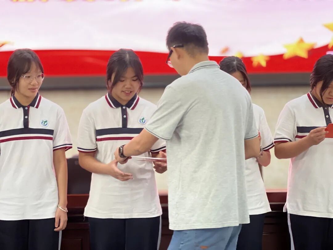 同学们,共青团徽章不仅是荣誉,更是责任。希望你们牢记习近平总书记对青年的嘱托,把"爱国、进步、民主、科学"的五四精神化作具体行动。让我们共同把"请党放心,强国有我"的誓言,变成操场上的奔跑声、实训车间的操作声、志愿服务的脚步声!