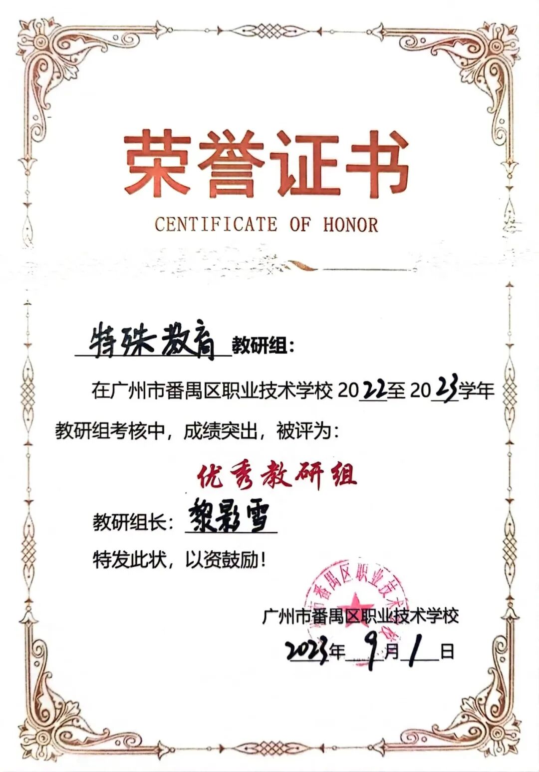 2.2024年在广州市教育研究院组织的2024年特殊教育教学优质资源征集活动中,论文《基于心理赋能视角下的中职特殊学生教育策略研究》荣获“二等奖”;