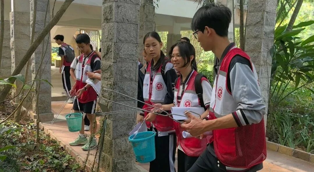 在宣教活动中,郭队长带领队员们开展了“环保行动”,发现公园内的树木和墙壁上大量聚集了田园害虫“非洲大蜗牛”,同学们立即对公园环境进行了“大扫除”,清理了附着在树杆、草丛中的福寿螺和非洲大蜗牛(这两种生物没有天敌,繁衍能力极强,需要及时干预),减少其对园林和生态环境的危害。