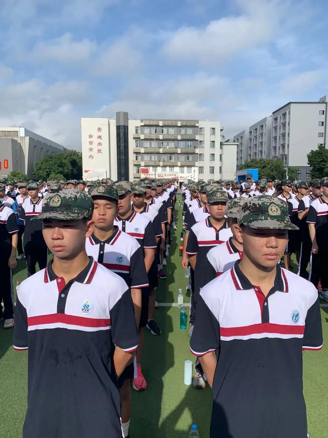 “同学们好,同学们辛苦了!”“为校争光!”职一萌新们经过军训的砺练,军姿威严、队列整齐。