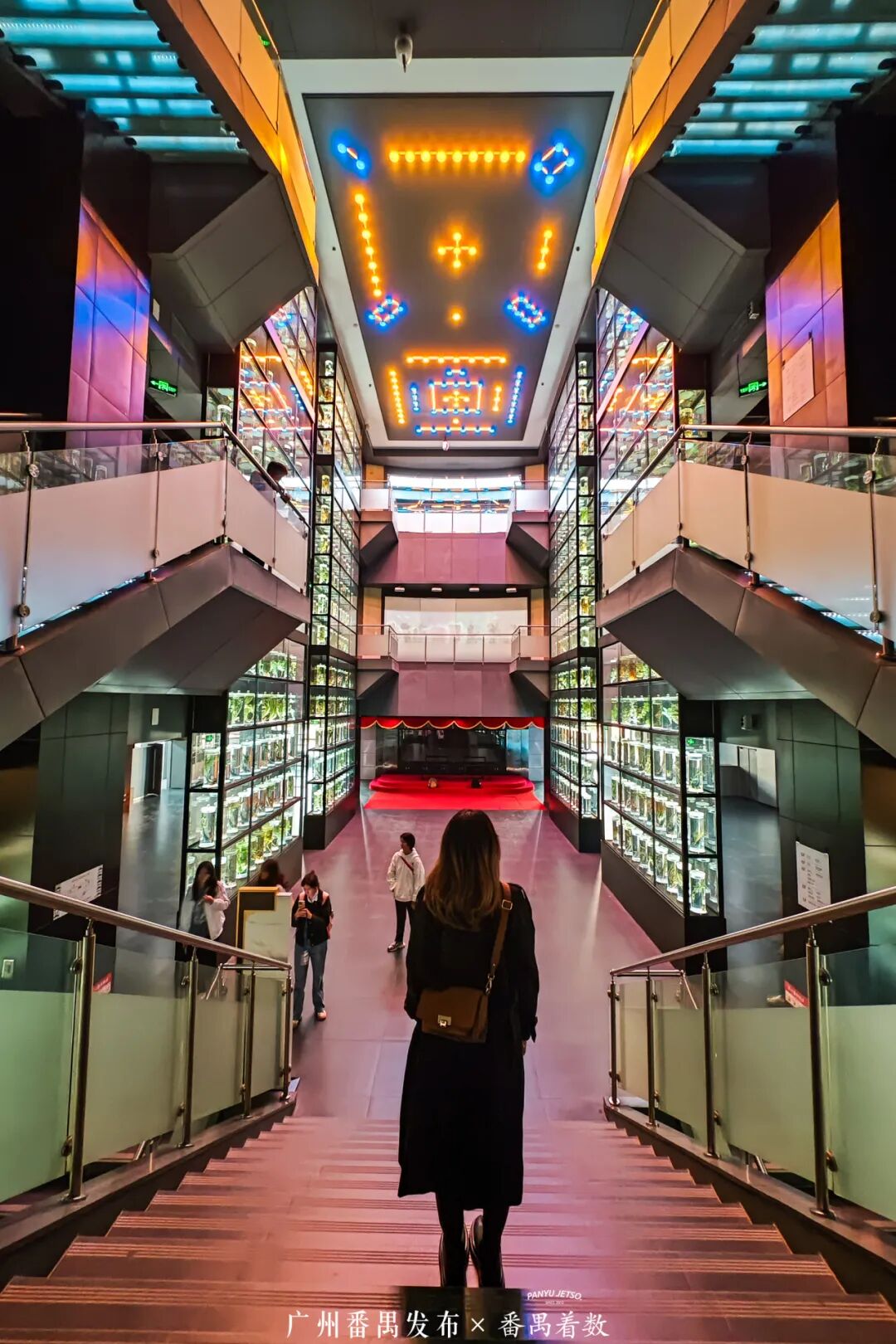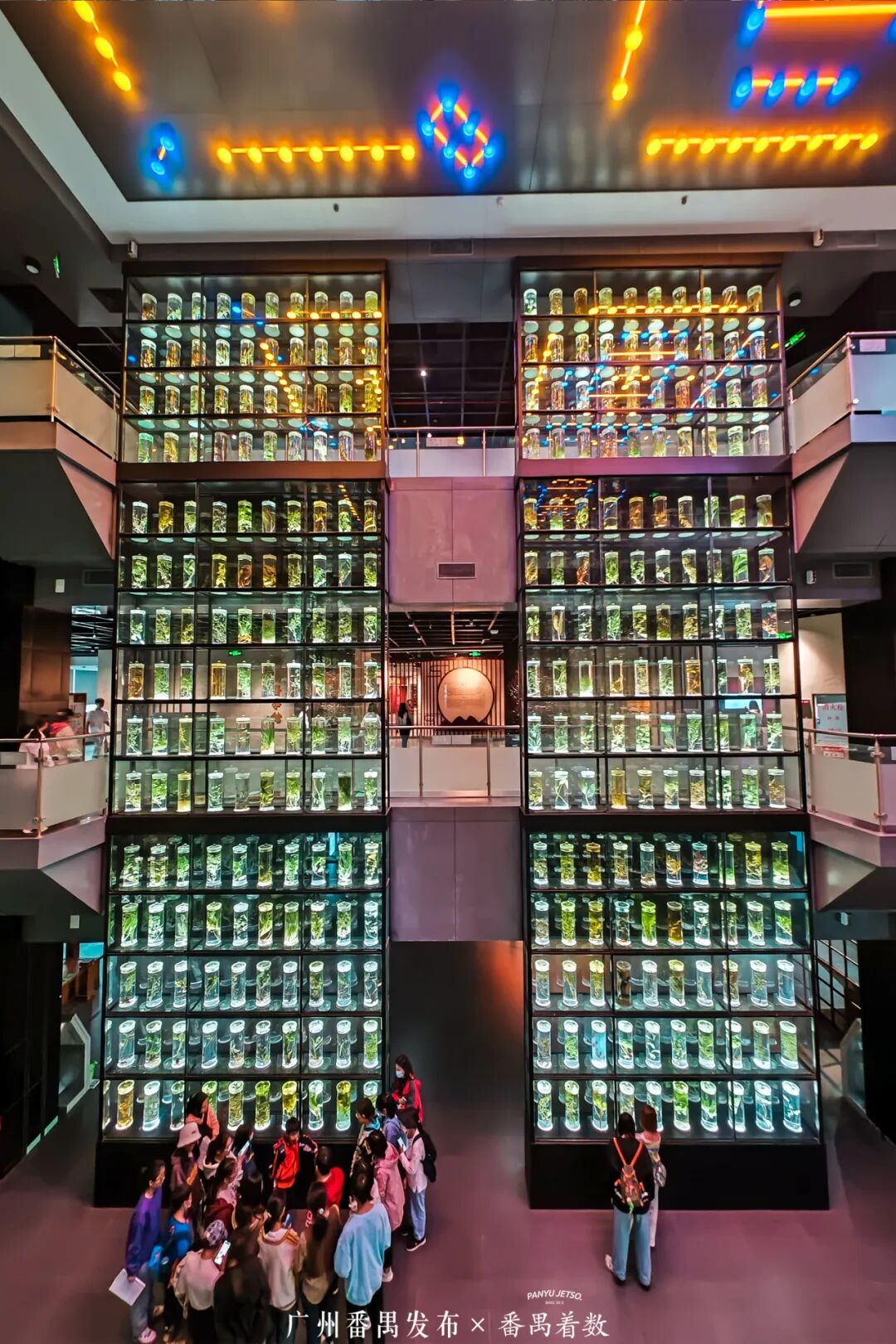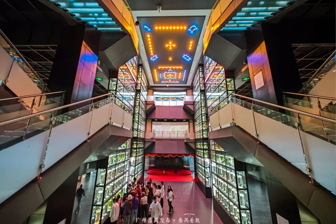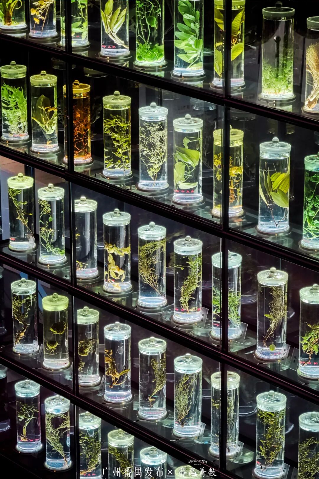 中药水晶宫令人眼前一亮,贯通三层的岭南中草药液浸标本墙,600瓶药用植物原色浸制标本晶莹通透,仰拍穹顶星芒,俯身“触碰”药草,科技感与自然美一键定格!