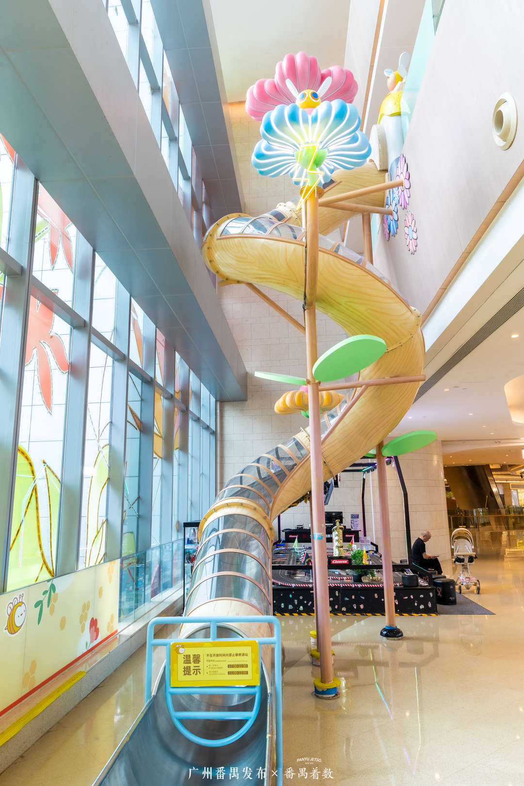 番禺天河城最大的亮点之一是超长旋转滑梯!从2楼滑到3楼,刺激又好玩,是孩子们的最爱。