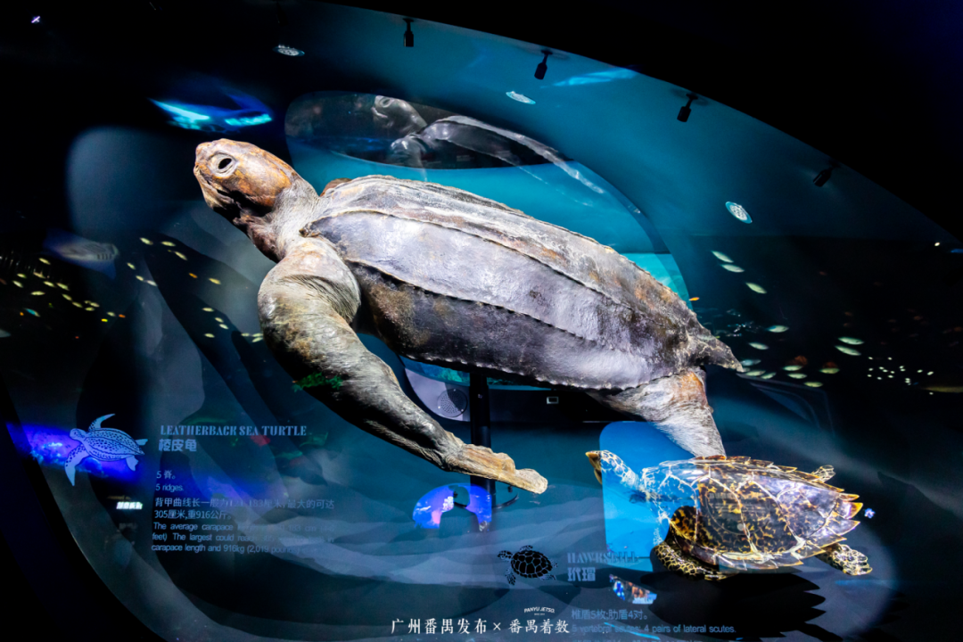 而在一旁,3 米长的「海龟之王」棱皮龟标本惊艳登场,巨大的身躯诉说着海洋的神秘与壮阔。旁边设有互动屏,轻轻点击,就能揭秘古海洋生物的奥秘。