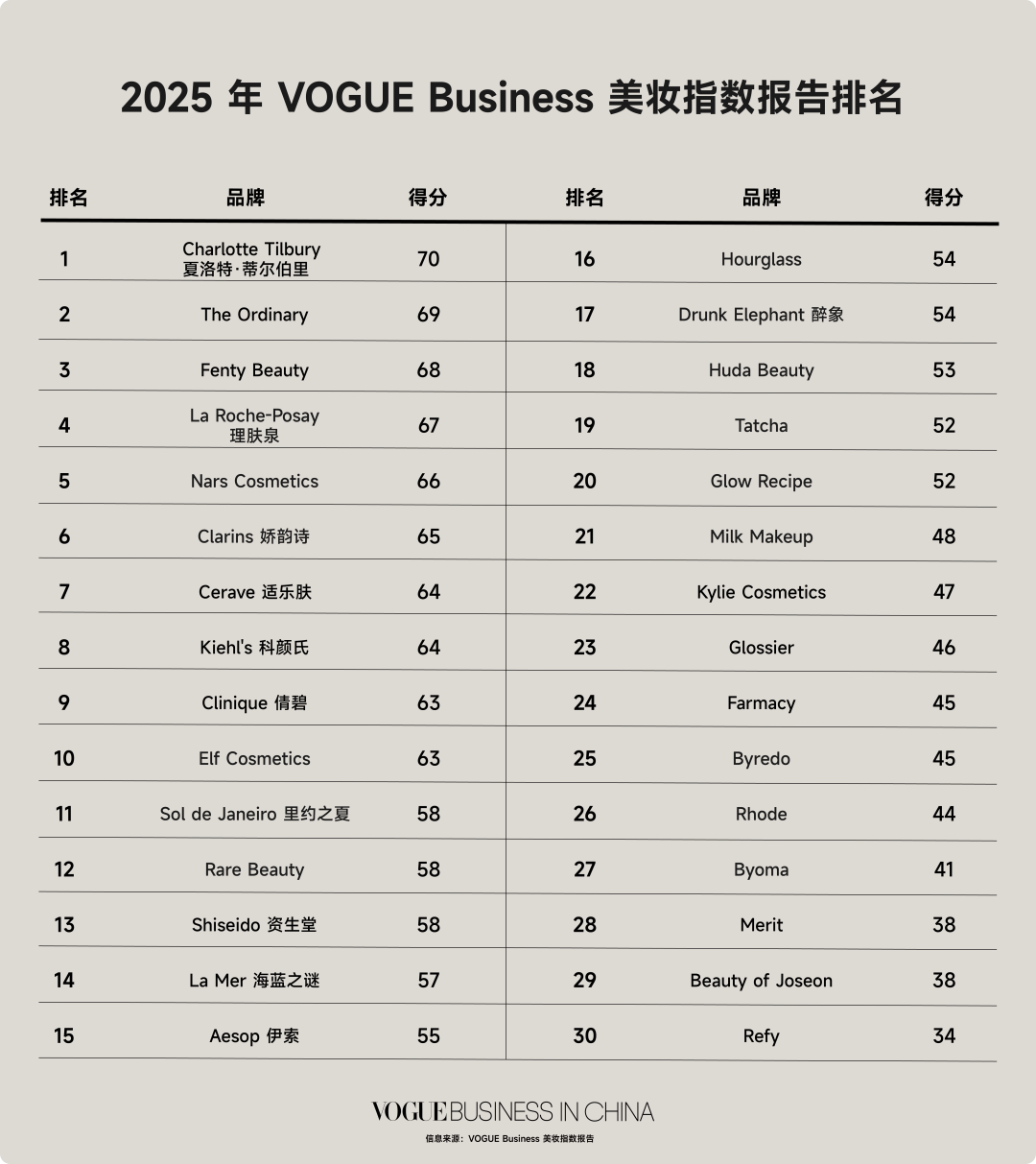 Charlotte Tilbury 首次登顶 VOGUE Business 美妆指数榜首,这也是自 2023 年美妆指数报告发布以来,The Ordinary 首次失去冠军宝座。
