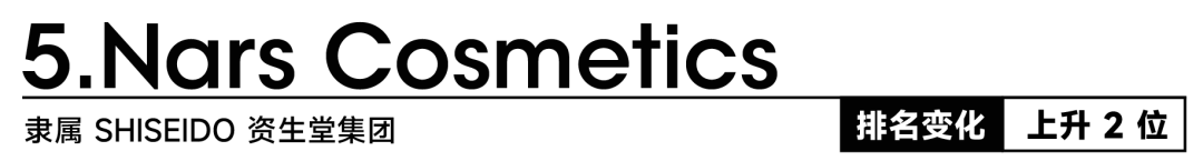 继 2023 年首期美妆指数报告中排名第四后,Nars 今年从 2024 年的第七位攀升两位,强势回归跻身前五。