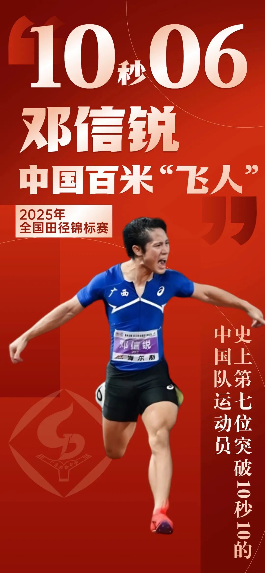 在8月3日晚举行的2025年全国田径锦标赛男子100米决赛中,广东实验中学校友邓信锐代表广西队,以10秒06的成绩收获男子100米冠军。