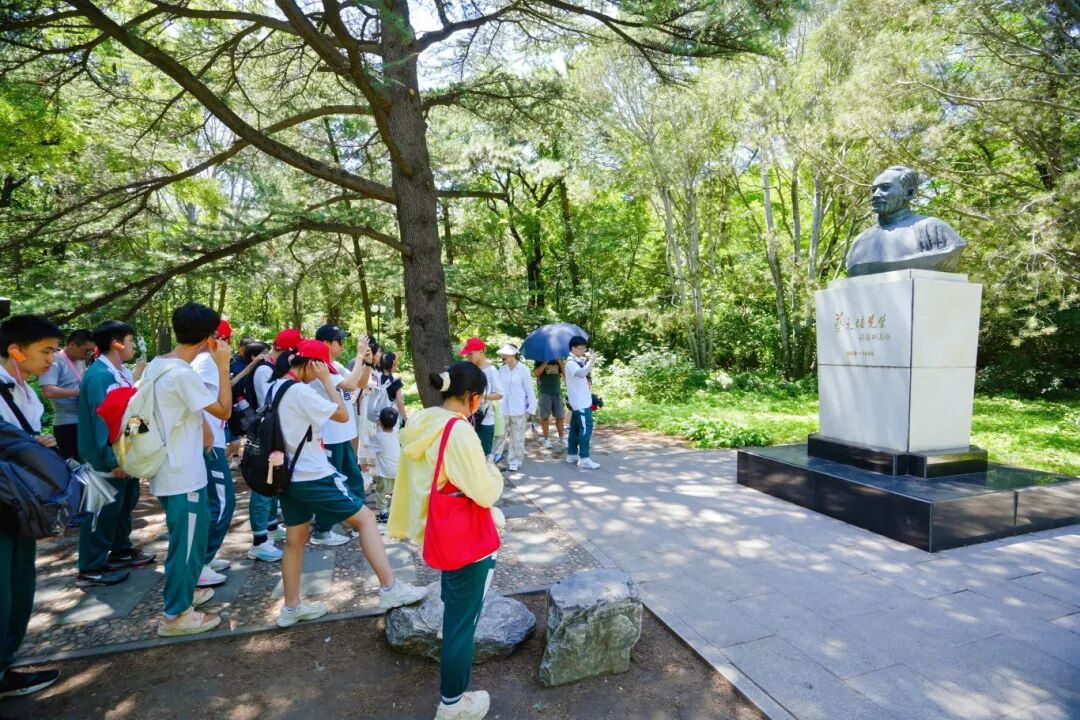 随后,同学们依次参观了冰心故居、冯友兰故居等名人旧庐,感受百年老校的人文底蕴;沿着北大的林荫校道一路向前,打卡李大钊雕像、蔡元培雕像,感受先辈们的奉献精神;在未名湖畔书香共读,于博雅塔下回首鎏年风华。博雅塔的倒影在水中微微颤动,仿佛在向同学们轻轻诉说它的故事。