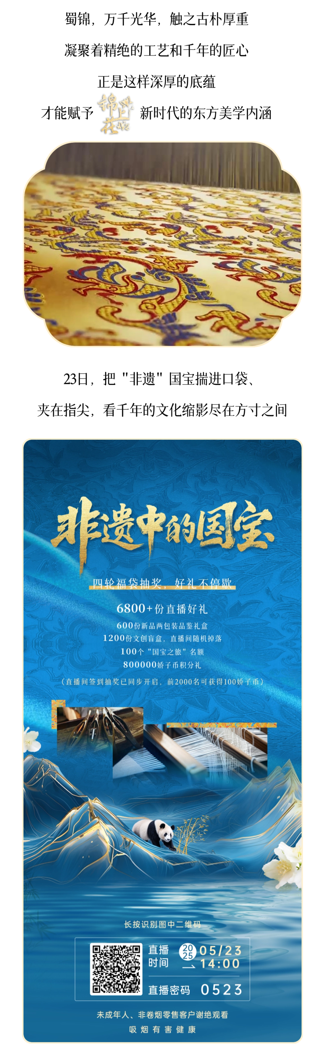 摘要:点进来,你就是“非遗国宝”传承人!茶道展示、蜀锦科普、国风雅韵,尽在 23 日直播间,速进!