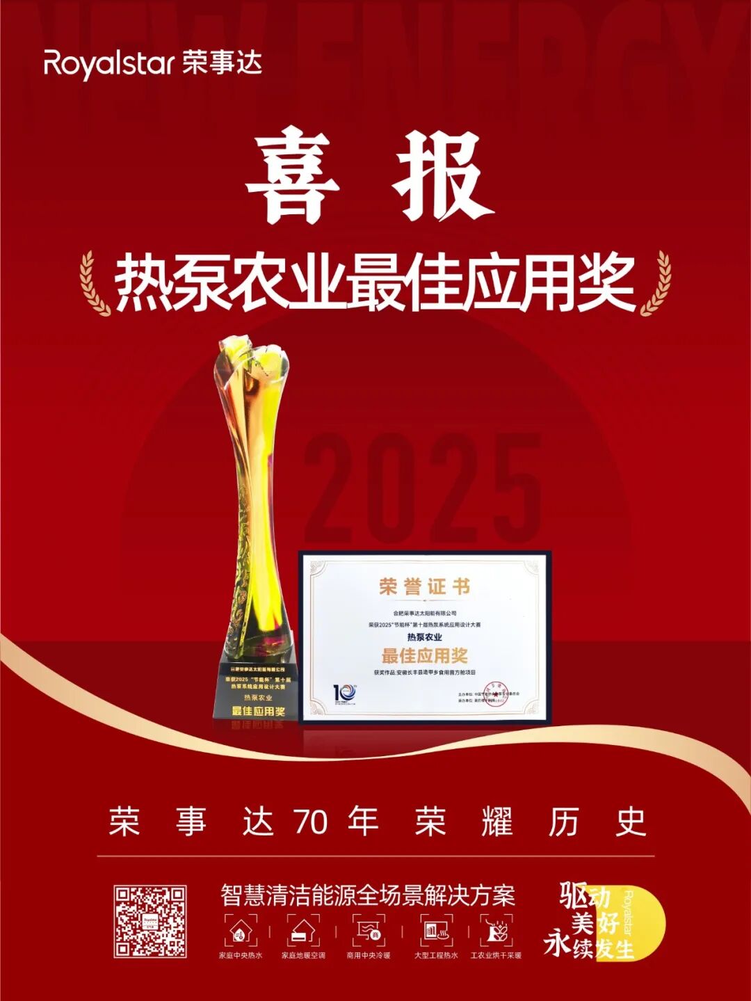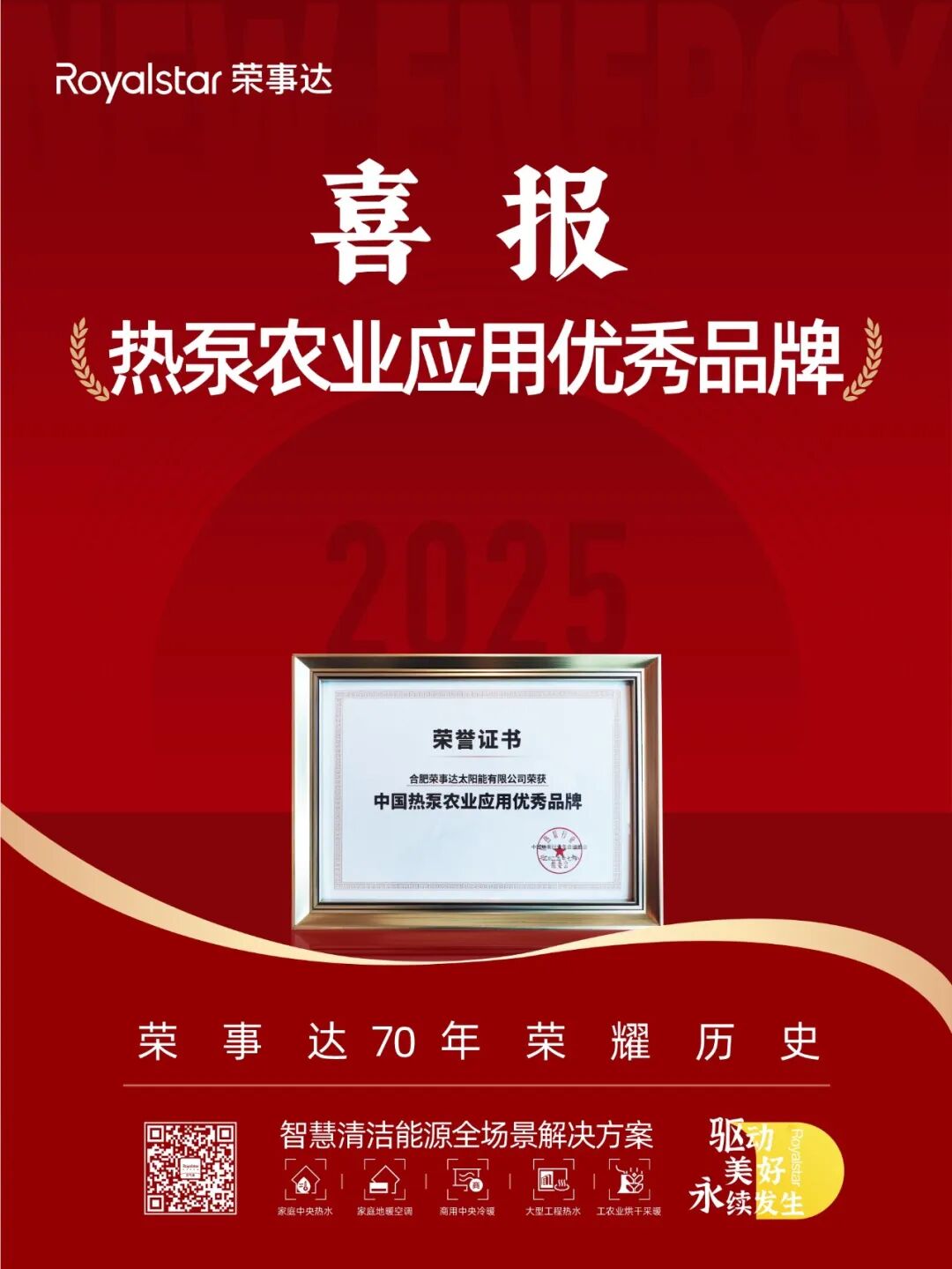 在创新性、实用性与推广价值这三大农业热泵应用核心维度的严格评估下,荣事达空气能成功摘得“热泵行业优秀农业应用品牌”奖项。
