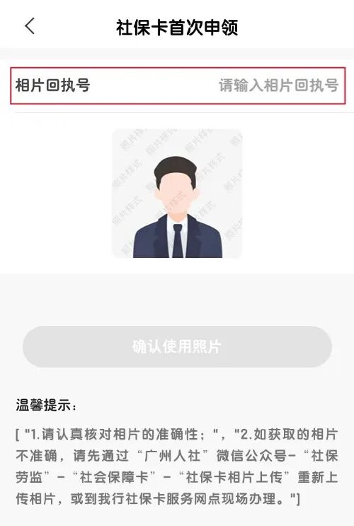 请提前通过“广州人社”微信公众号或“穗好办”APP获取相片回执号。