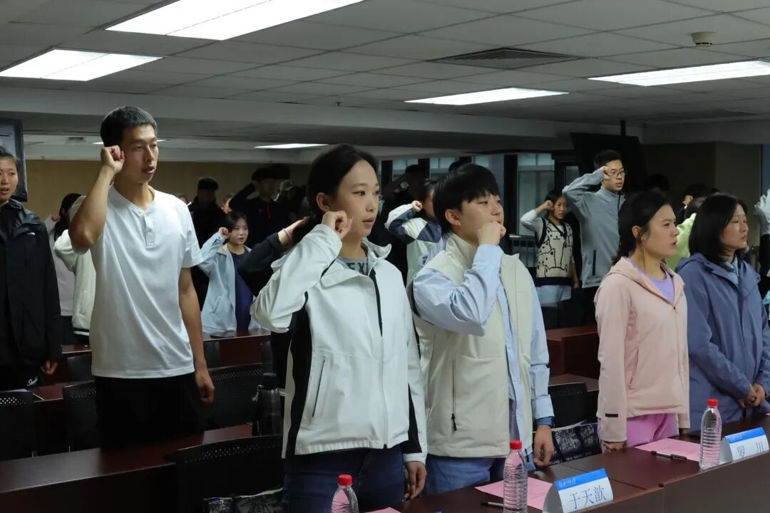 全体起立,主持人带领大家举起右拳宣誓。