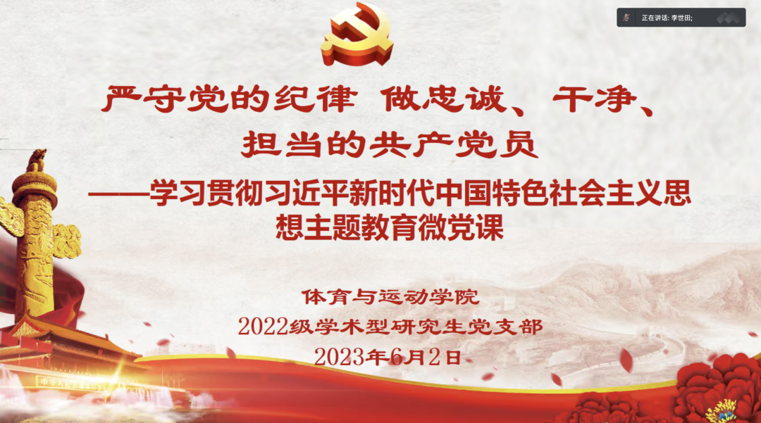 为深入学习贯彻习近平新时代中国特色社会主义思想主题教育,深刻领会开展主题教育的重大意义和目标,进一步推进支部纪律建设,提高党员廉洁意识,营造风清气正、廉洁自律的支部环境,按照学院党委统一部署,2023年6月2日,体育运动学院2022级学术型研究生党支部在线上召开“严守党的纪律,做忠诚、干净、担当的共产党员”主题微党课,党支部书记李世田担任主讲,支部全体党员参加本次党课学习。