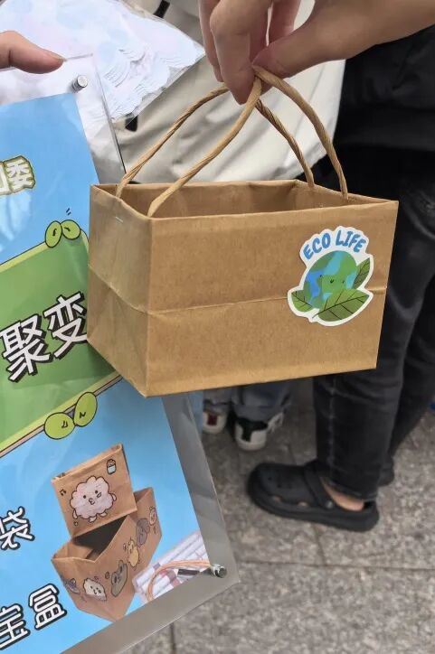 3月1日,正午时分,环境学院团委召集志愿者们,在邱季端体育馆南侧开展“雷锋日”外场活动——“盒聚变”废旧纸袋再利用环保手工活动。