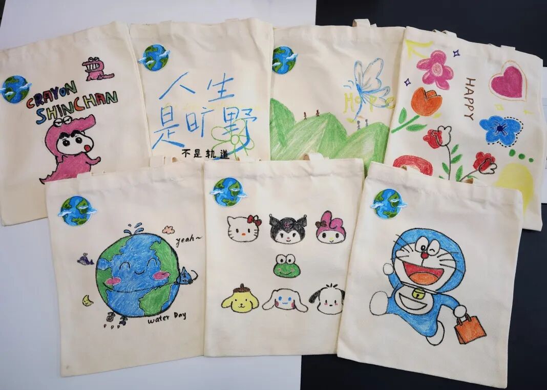帆布袋图案DIY环节更是妙趣横生,无论是志愿者还是捐赠者,都化身为“神笔马良”,自然风光、动漫人物、未来寄语等都在大家的画笔下栩栩如生,活动现场洋溢着欢乐和团结的氛围。绘制的环保帆布袋将赠予流域综合管理教研所硕士党支部环境科普教育合作学校云南东屏小学的小朋友们,以更实用、更童趣的形式鼓励他们树立绿色低碳的环保理念,充分展现了环境学子的爱心和责任感,表达了环境er对东屏小学孩子们的美好祝愿。