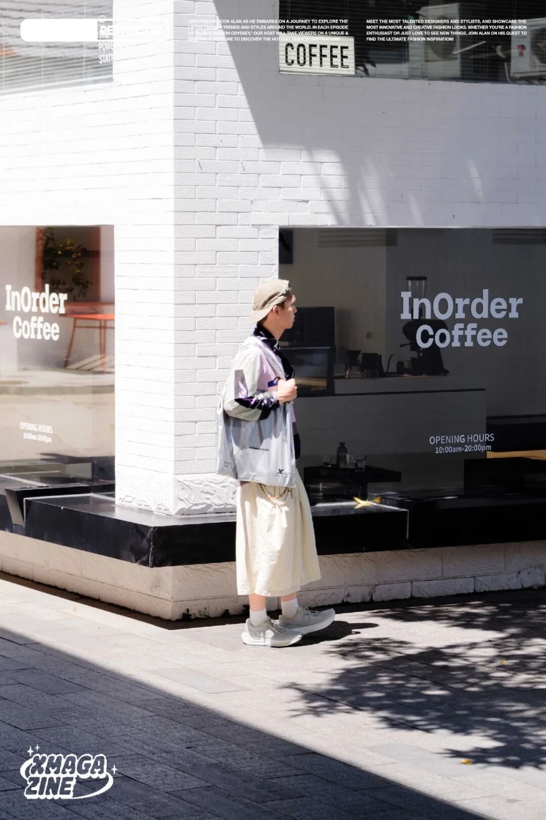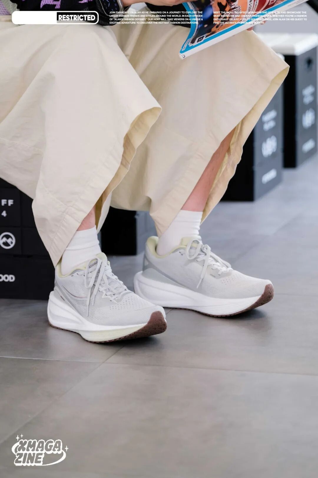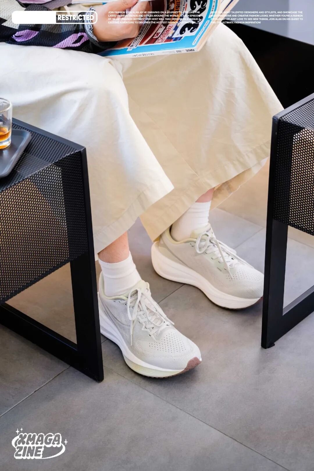 第二套造型,则更偏向日常休闲。我换上了一条白色阔腿八分裤和一件网眼长袖 tee,把青云旗舰缓震当成一双日常通勤鞋来穿。镜头切换到跑道边的咖啡小店,微风吹动衣摆,我随意坐在户外的木椅上,脚下的青云显得低调而精致。
