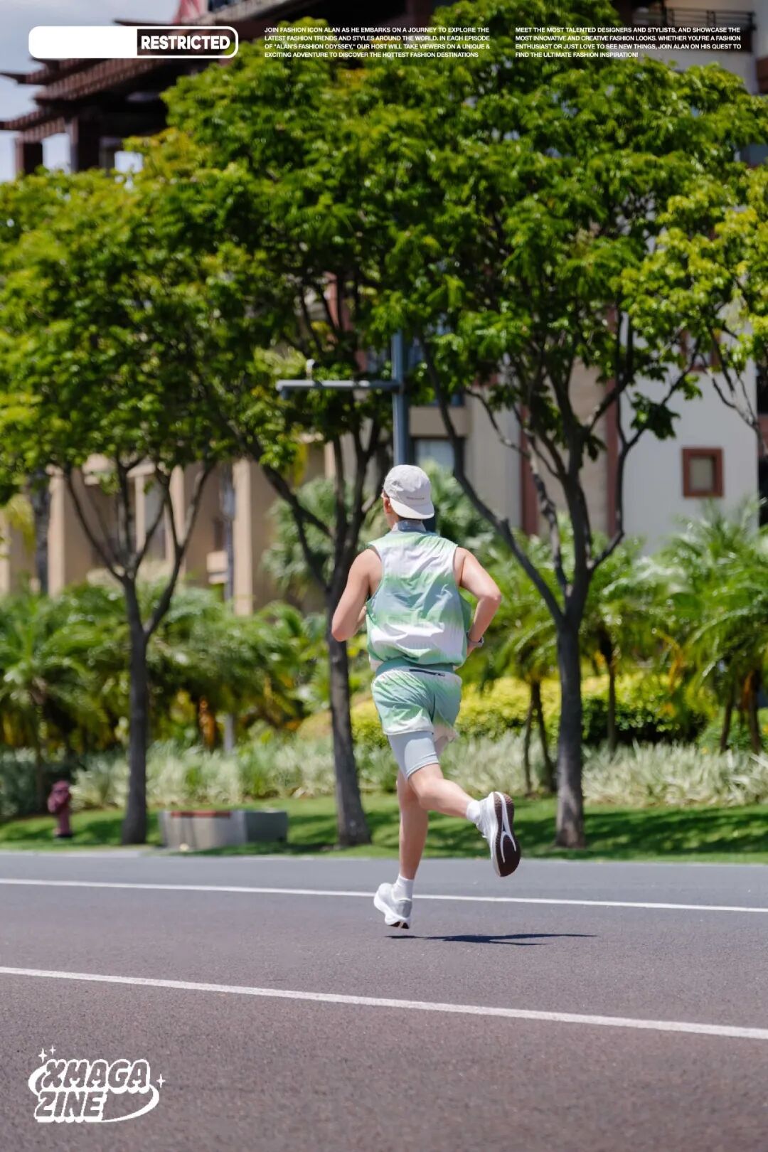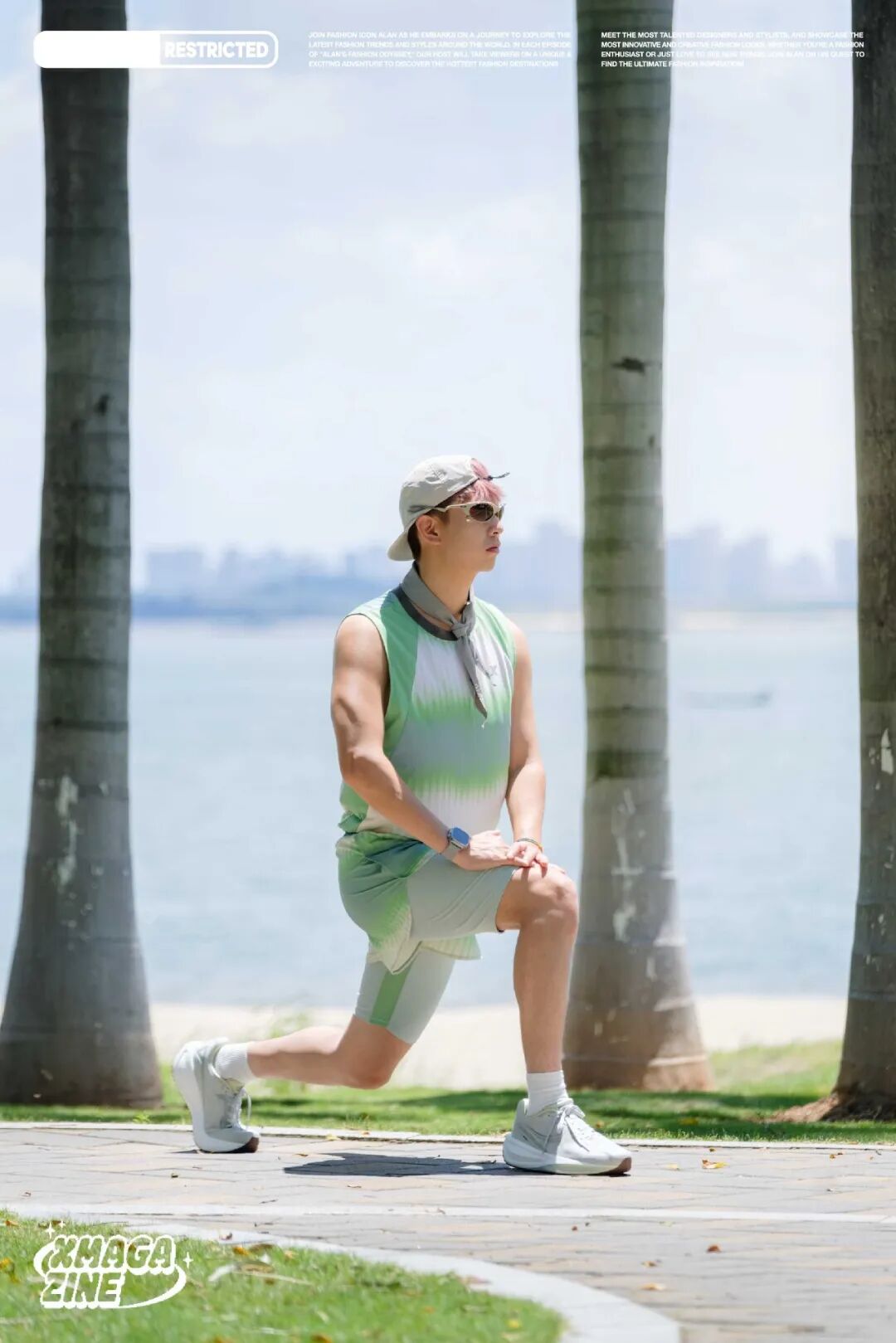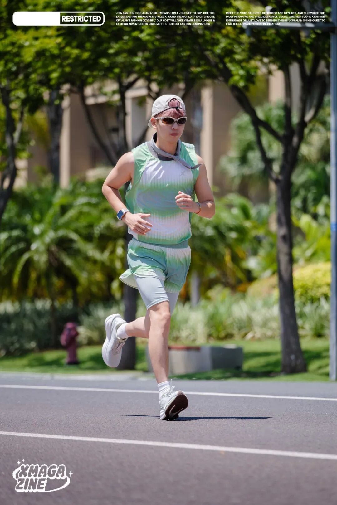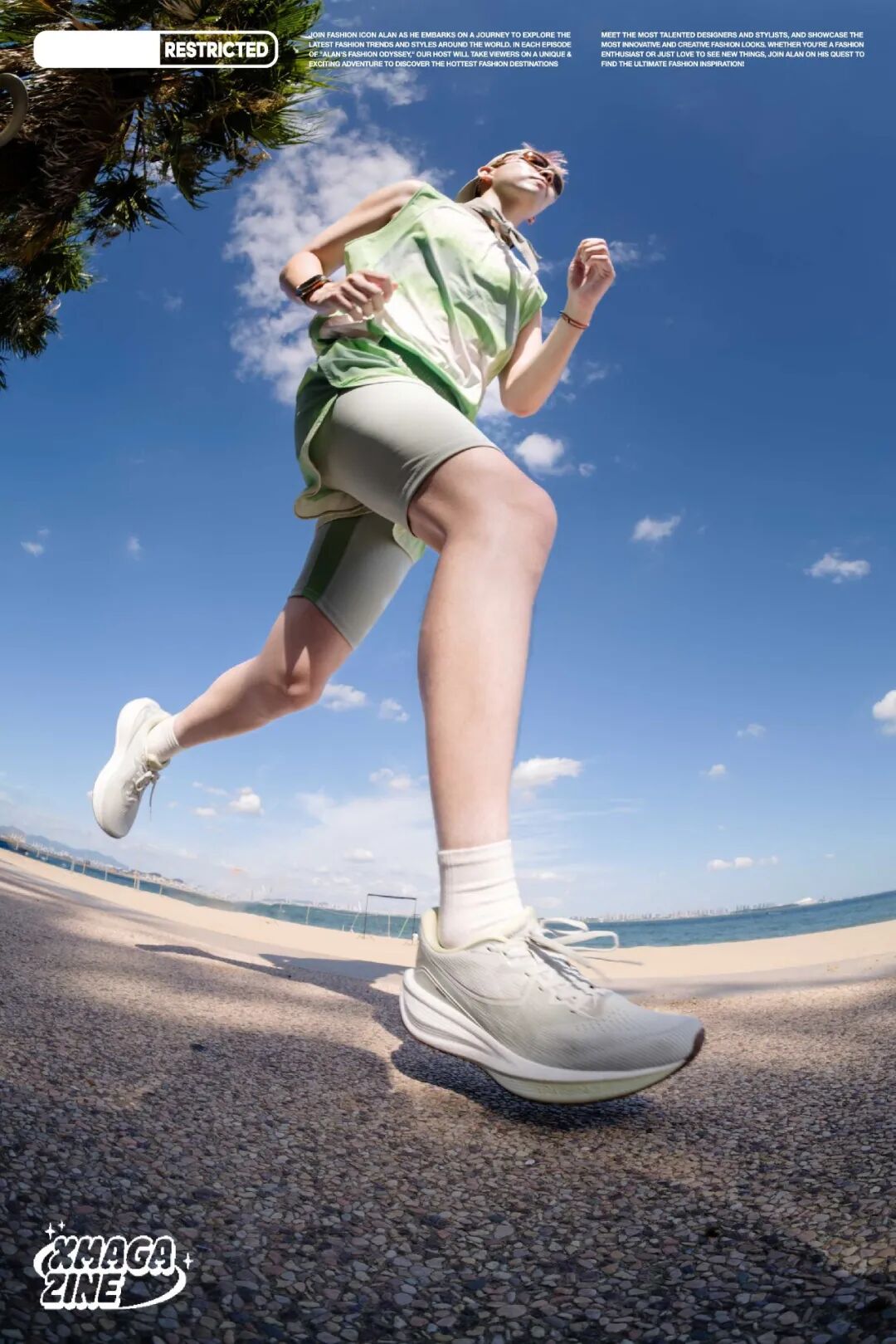 这次拍摄我准备了两套造型。第一套是跑者造型,我换上了浅绿色系的跑步背心和短裤,与青云旗舰缓震的鞋身颜色相呼应。站在环东浪漫线的起点,镜头里是我与大海平行的身影。开跑后的第一感受,是鞋底传来的柔和回弹。得益于全掌搭载的 XTEP ACE 缓震科技,既有澎湃的能量反馈,又不会过分“弹”,而是兼顾了舒适和稳定。对于 LSD 长距离训练来说,这种缓震脚感能够有效减少膝盖和小腿的负担。